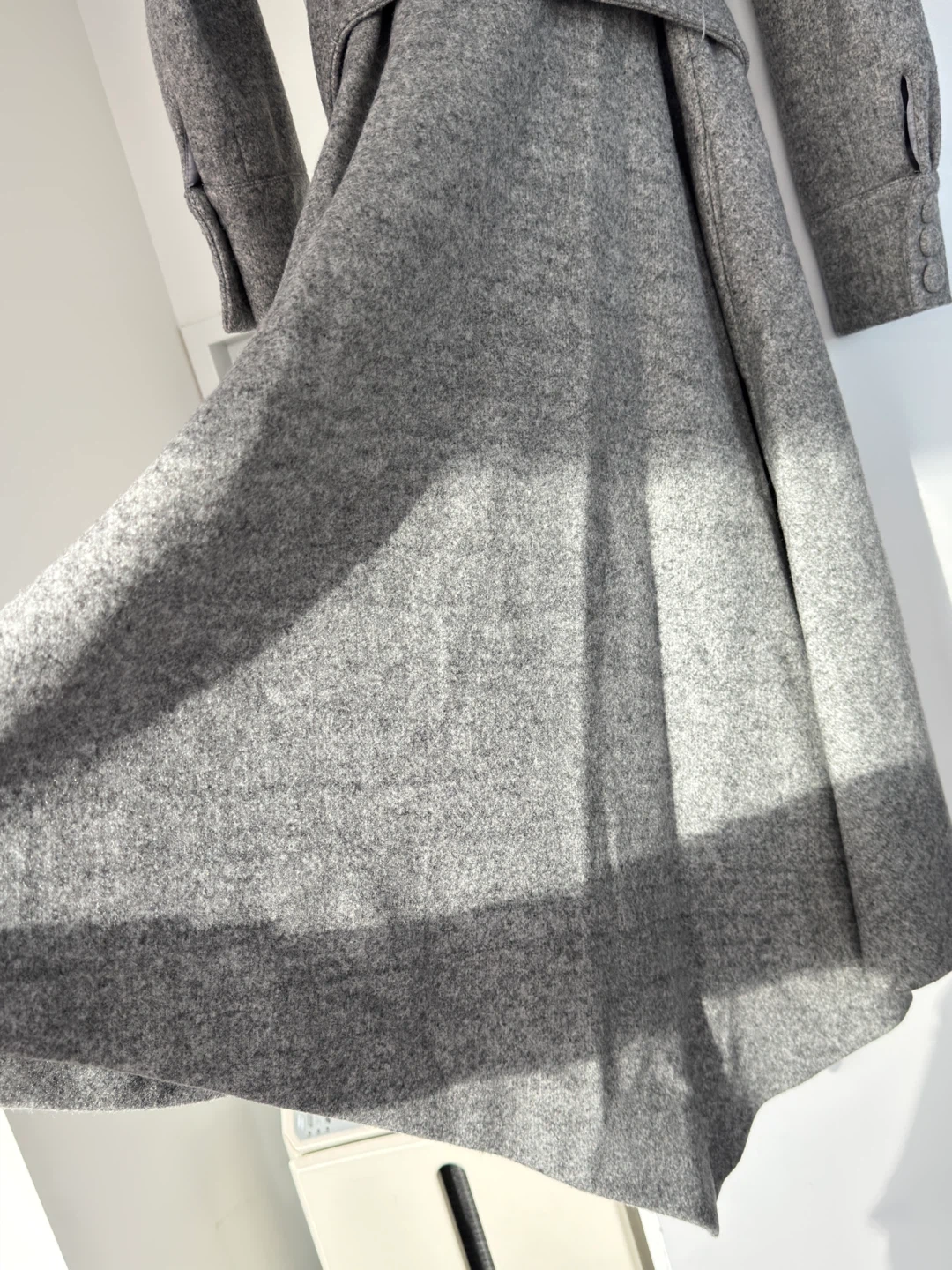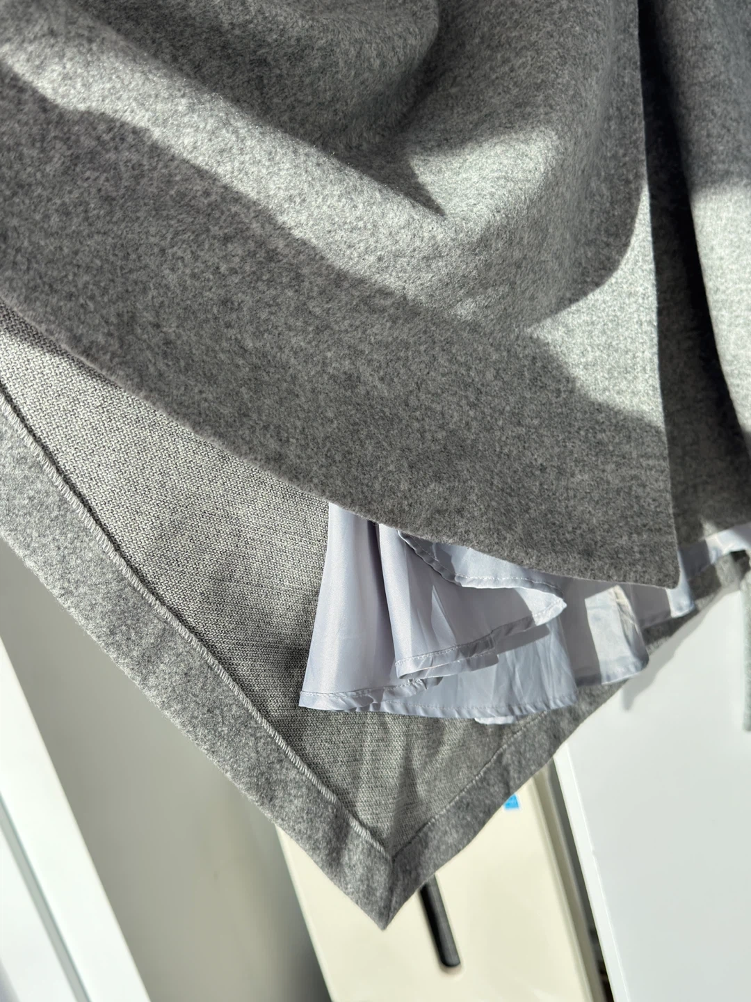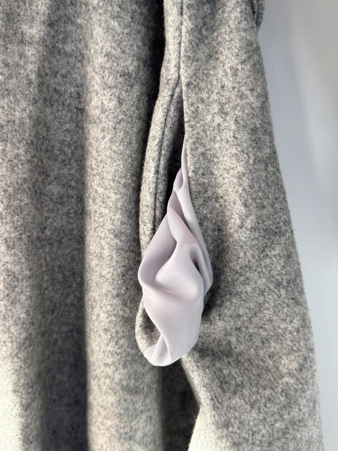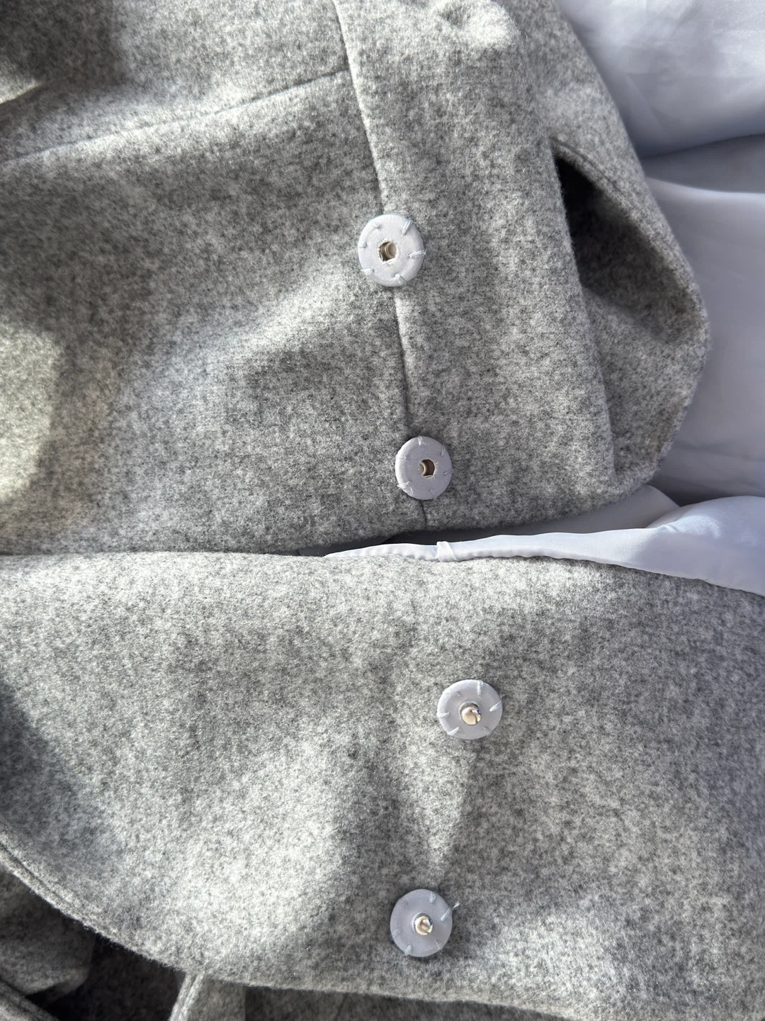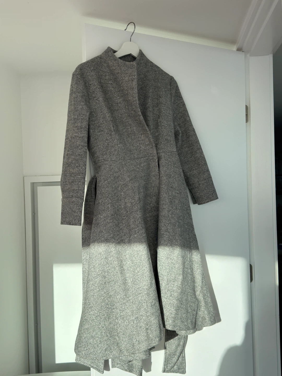 270Selling a stylish grey wool blend wrap coat! It's in great condition and perfect for layering during the cooler months. The wrap style is super flattering and the wool blend will keep you cozy