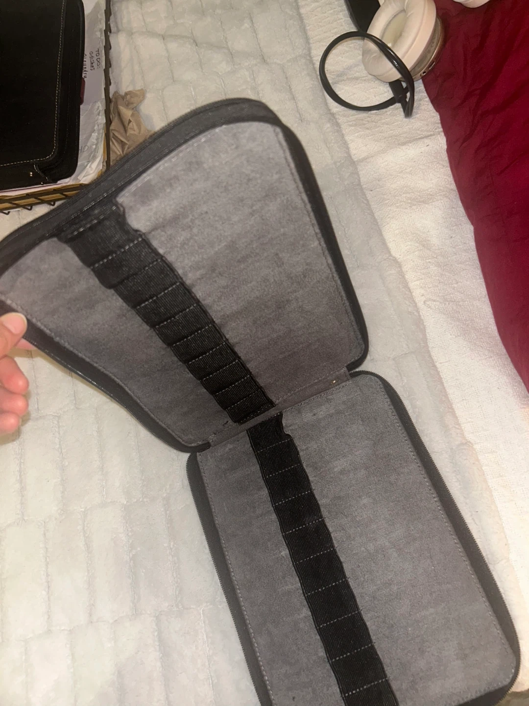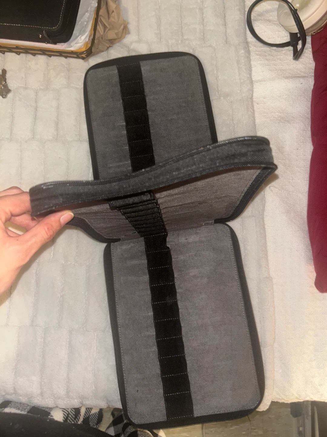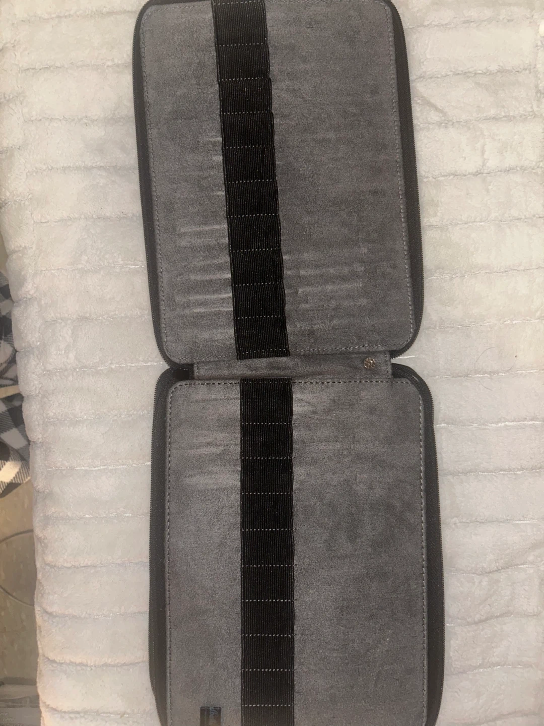 98I'm selling a zippered carrying case. It is grey in colour and has elastic straps inside to hold items in place. It's in good condition and ready for a new home! For pens pencils etc.