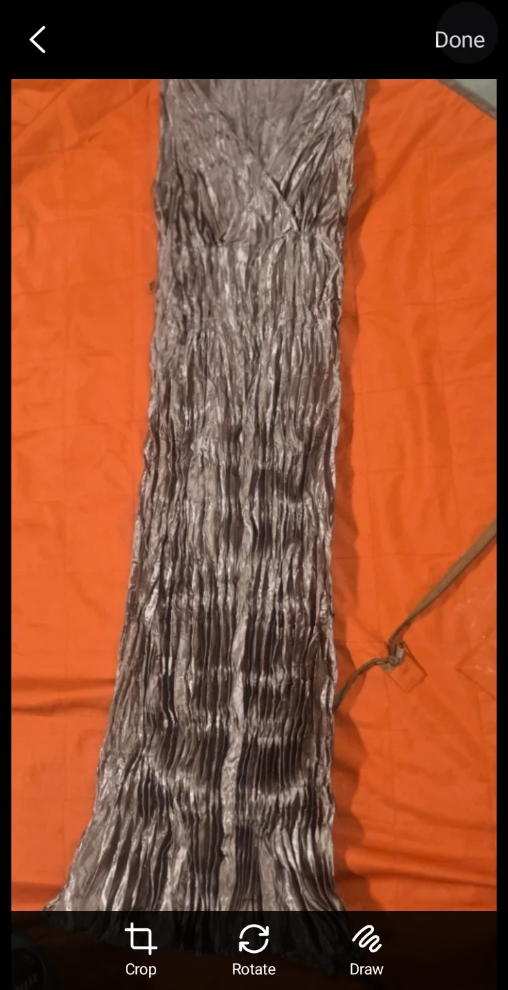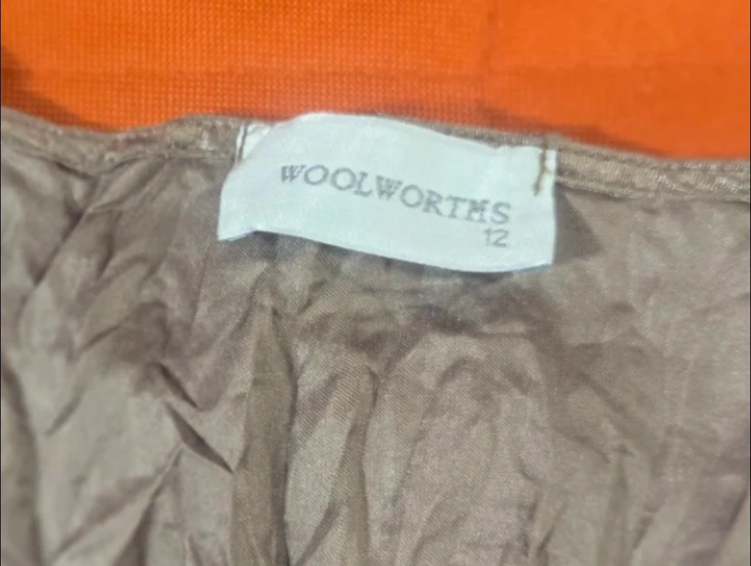 This is a shimmering ruched maxi dress from Woolworths. It's a size 12 with a V-neckline and a flowy, floor-length silhouette. Perfect for an evening out or a special occasion!