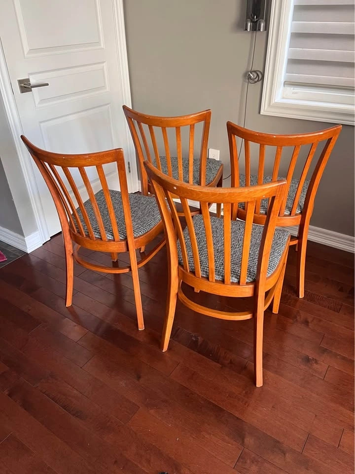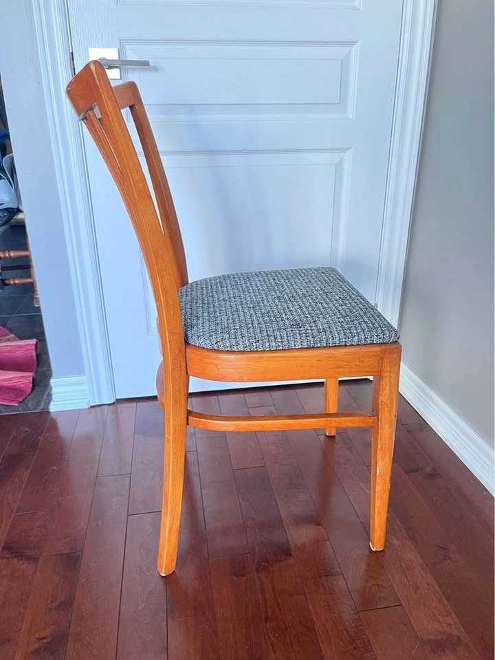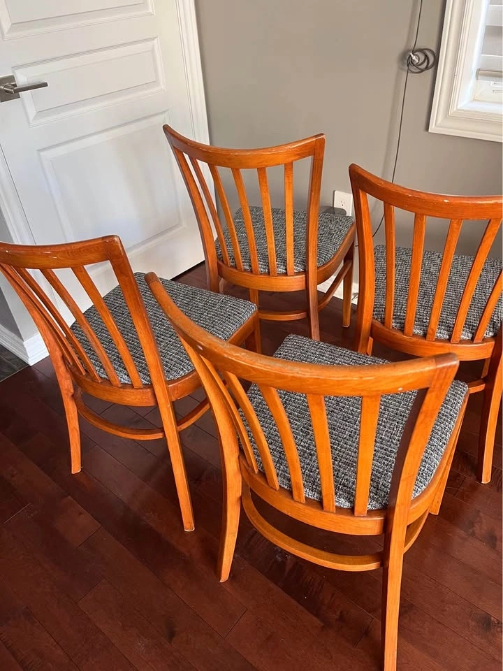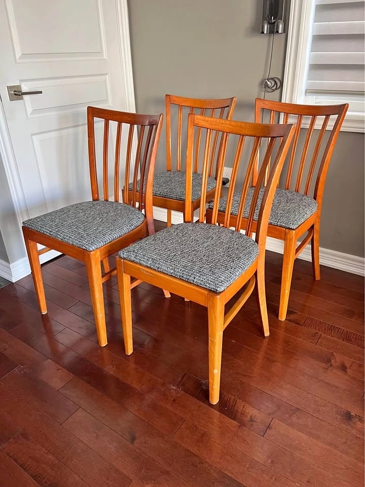 Four vintage bentwood style dining chairs, newly upholstered in a gray textured fabric. All chairs are sturdy with age-appropriate wear.