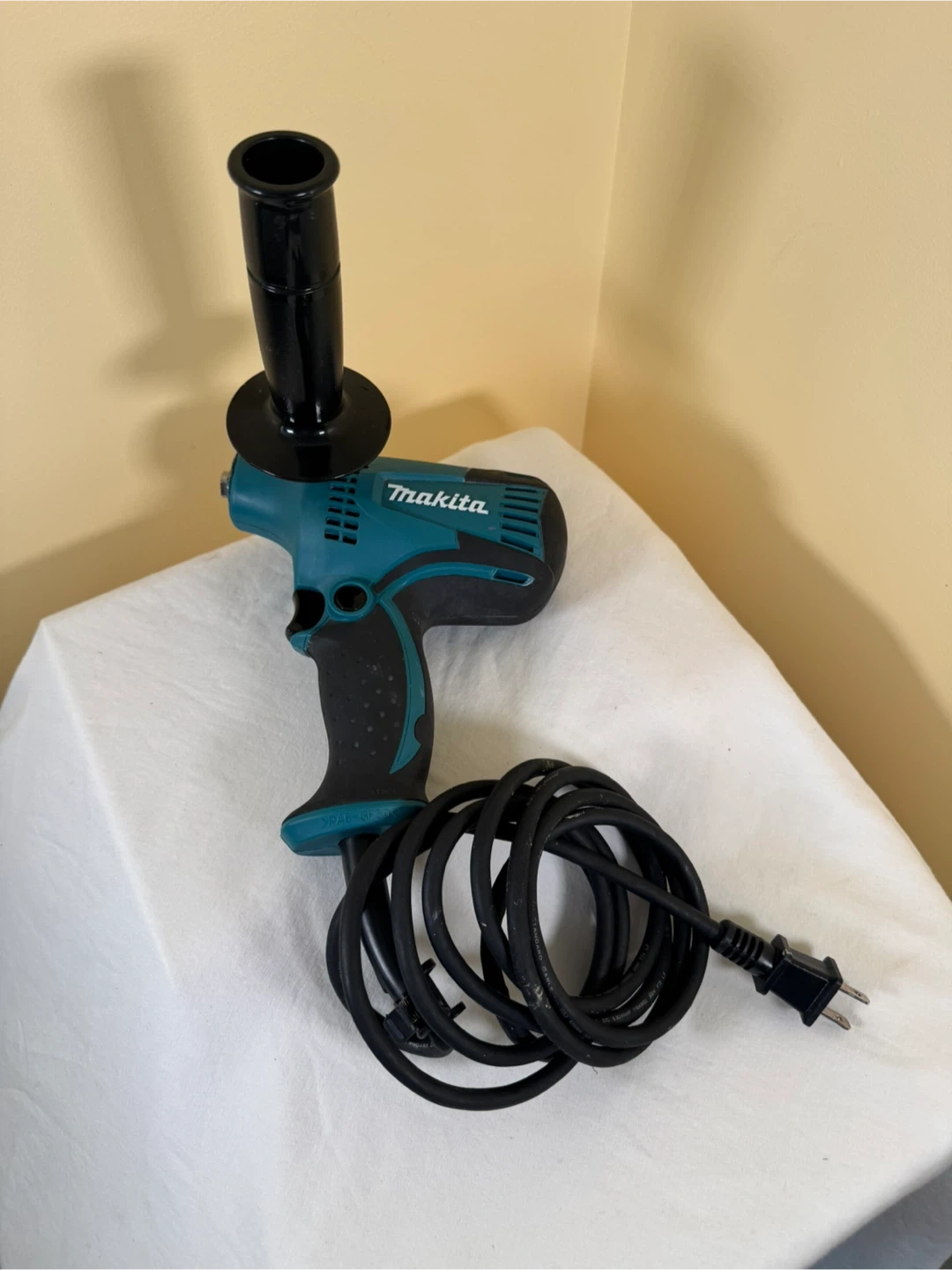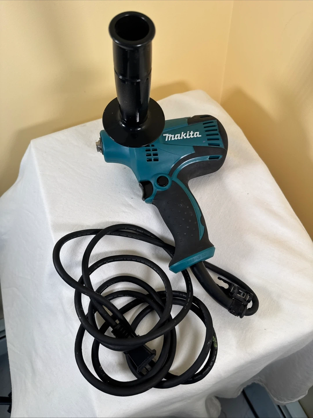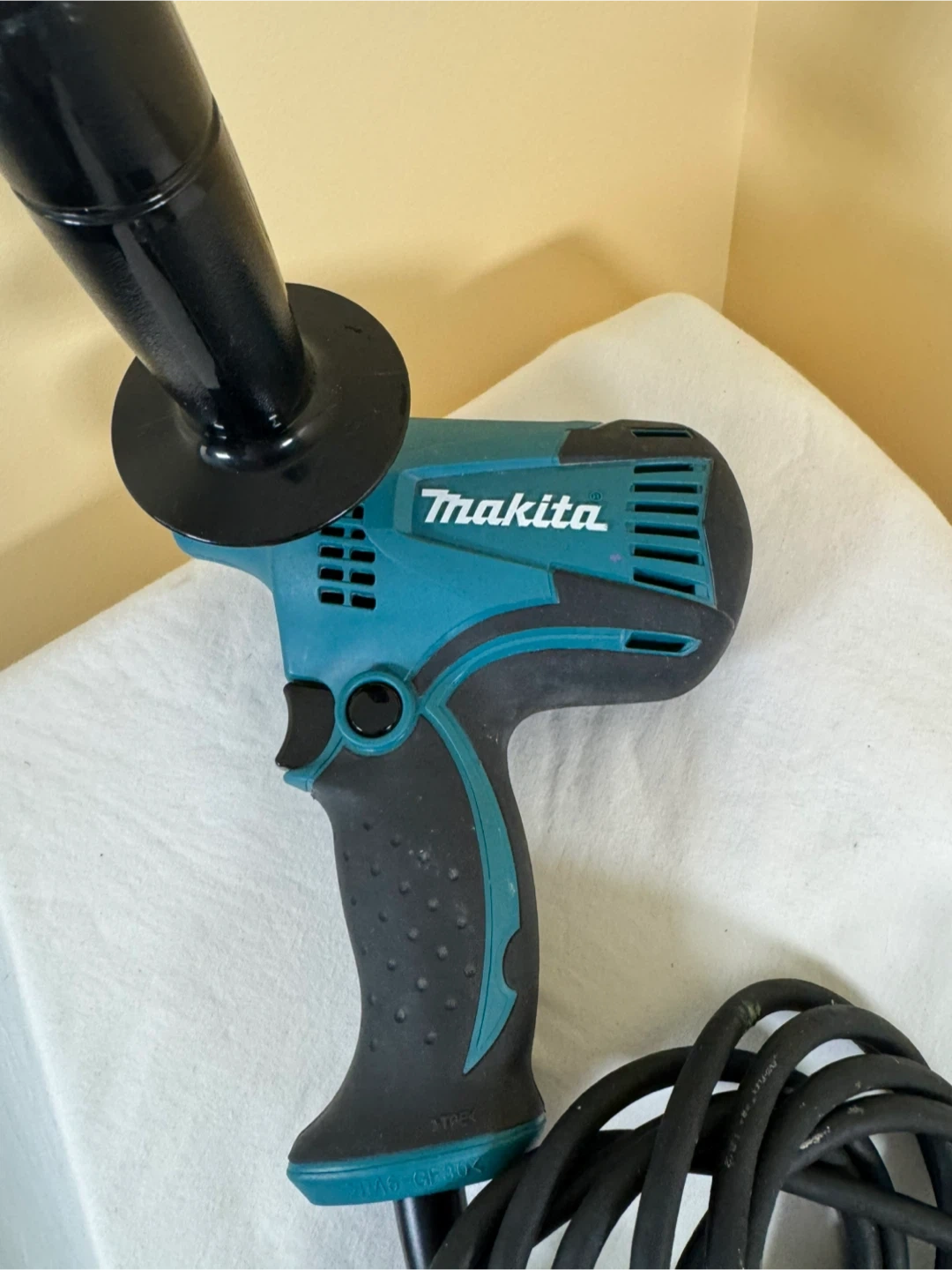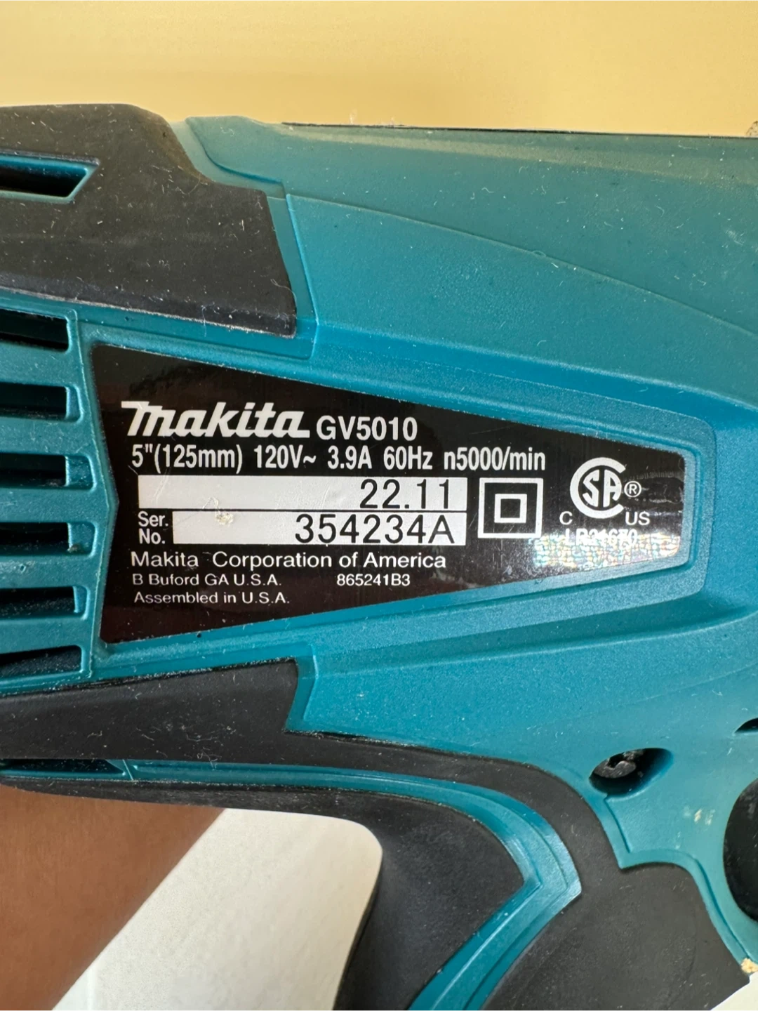 Makita GV5010 5" angle grinder. 120V~ 3.9A 60Hz n5000/min. Includes auxiliary handle and power cord. Assembled in U.S.A.