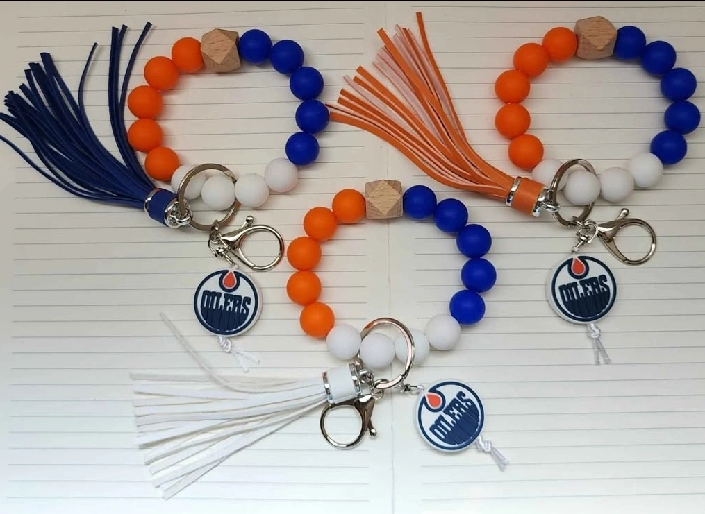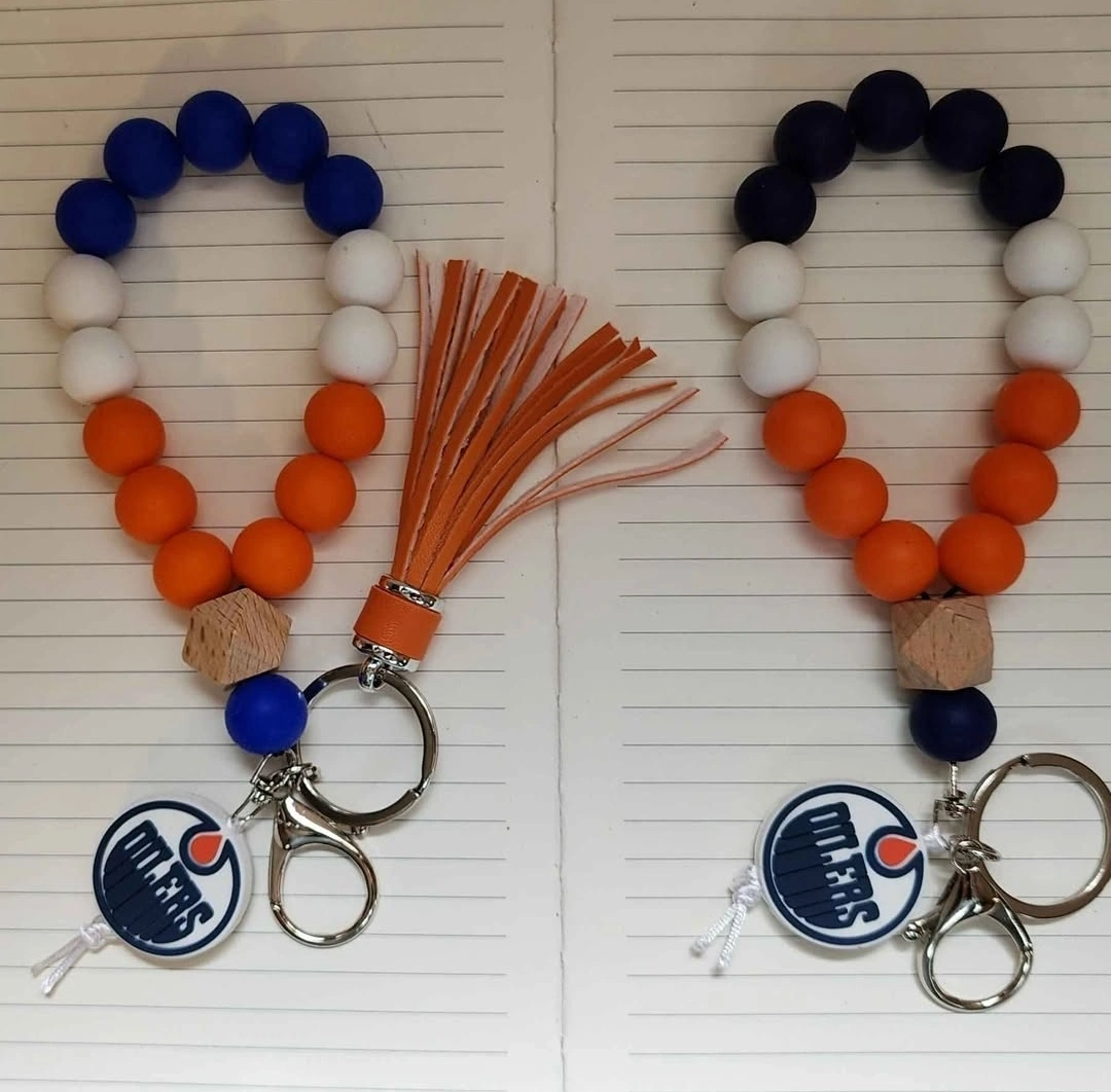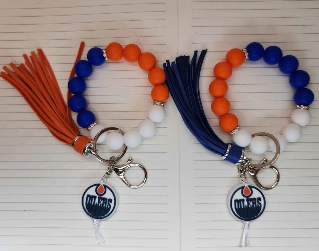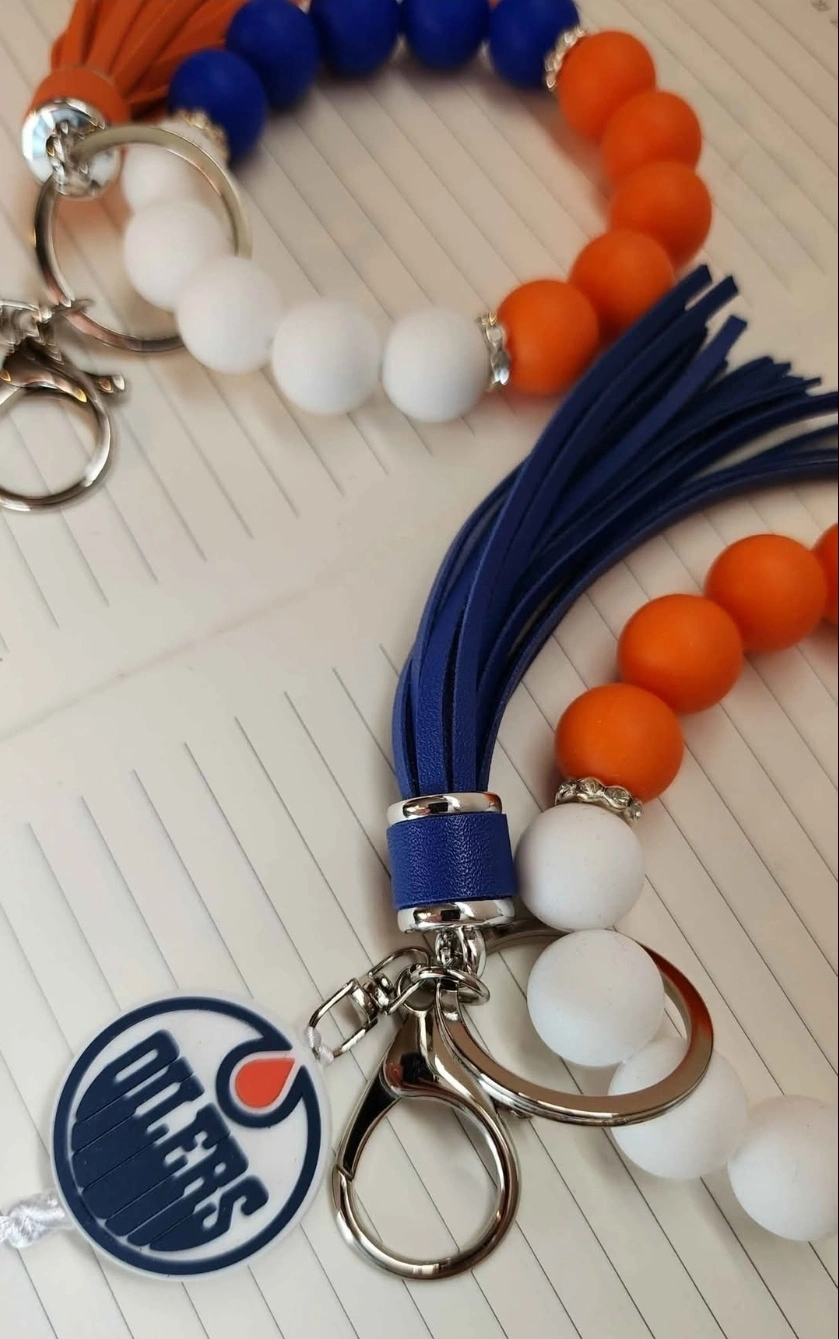 Show off your Oilers pride with these beaded keychain bracelets! They feature the team logo and come in a variety of colours, including orange, blue, and white. Perfect for keeping your keys handy while repping your favourite team