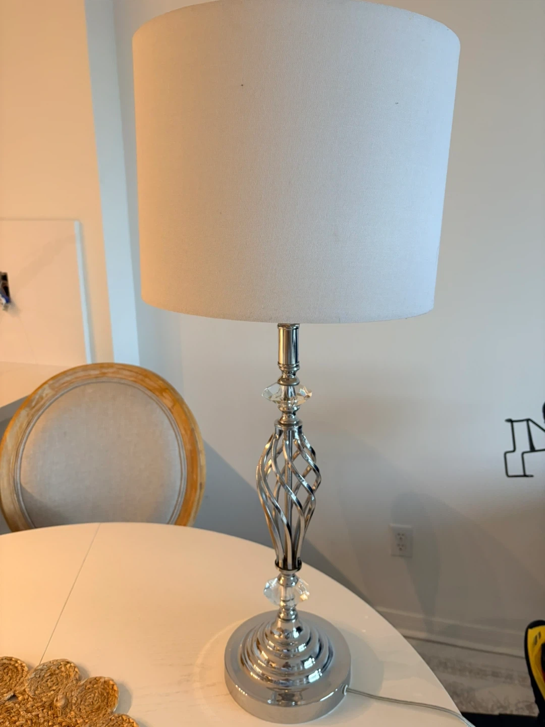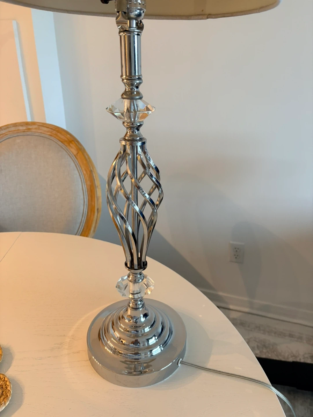 Add a touch of contemporary elegance to your space with this beautiful table lamp. It features a unique polished chrome "twist cage" base accented with crystal-style details and a neutral drum shade that fits perfectly with any decor.