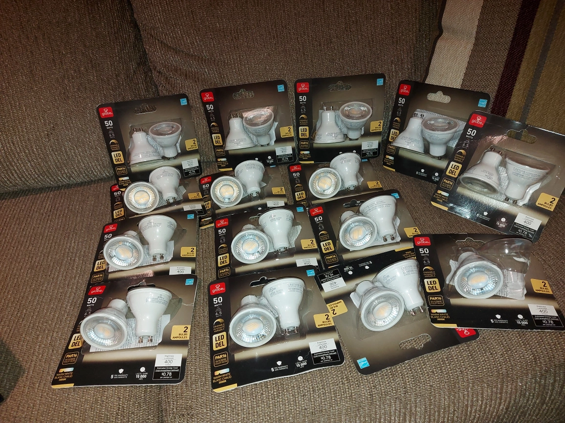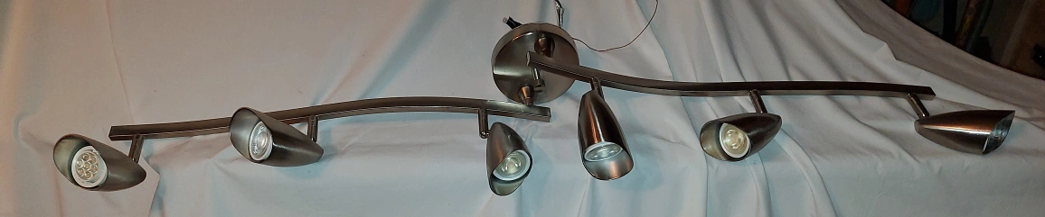 Selling a track lighting fixture along with a bunch (29 to be exact) of Grille LED light bulbs. Three lights per "arm". The bulbs are 50W equivalent, 6.5W power, and 400 lumens. They're all new and in their original packaging!