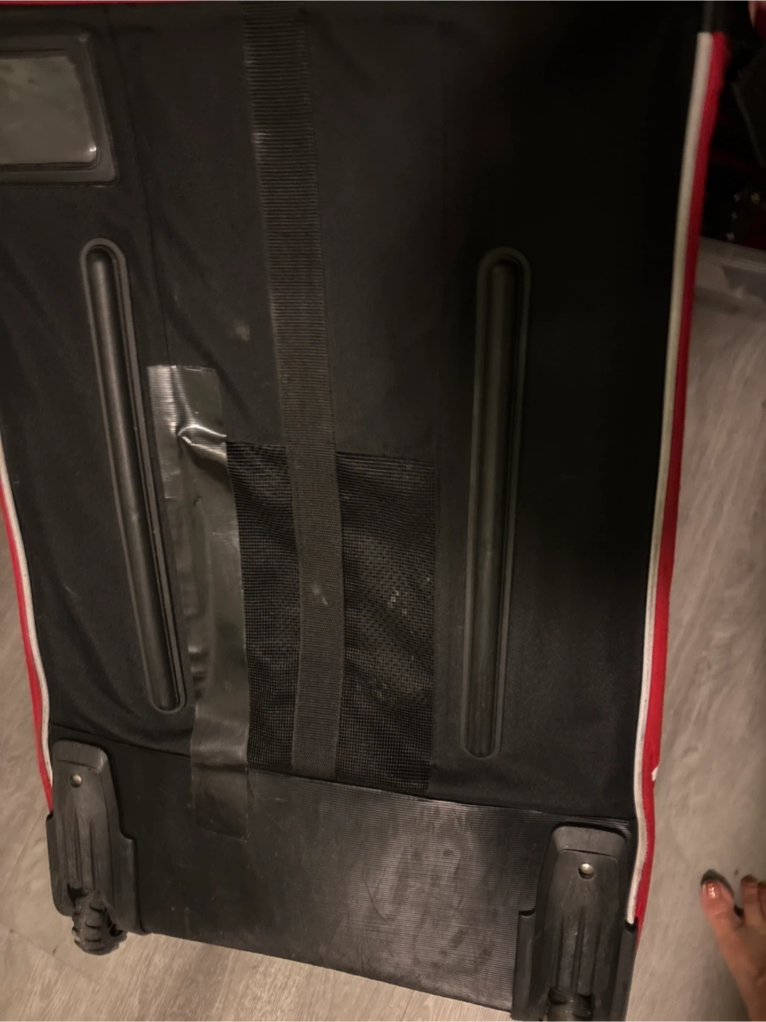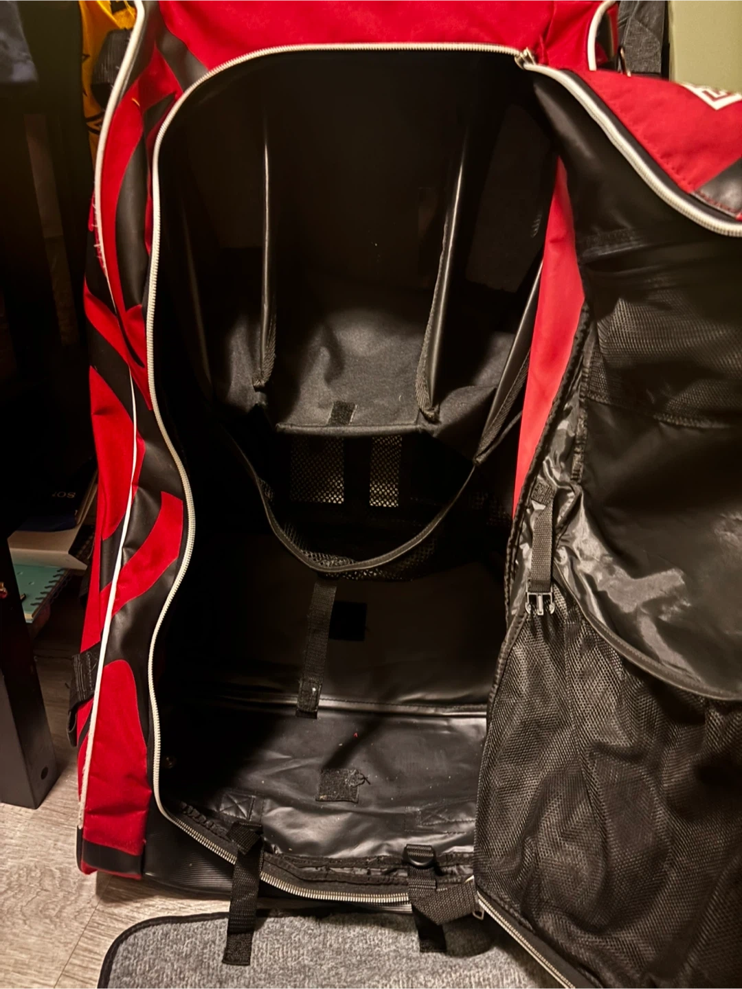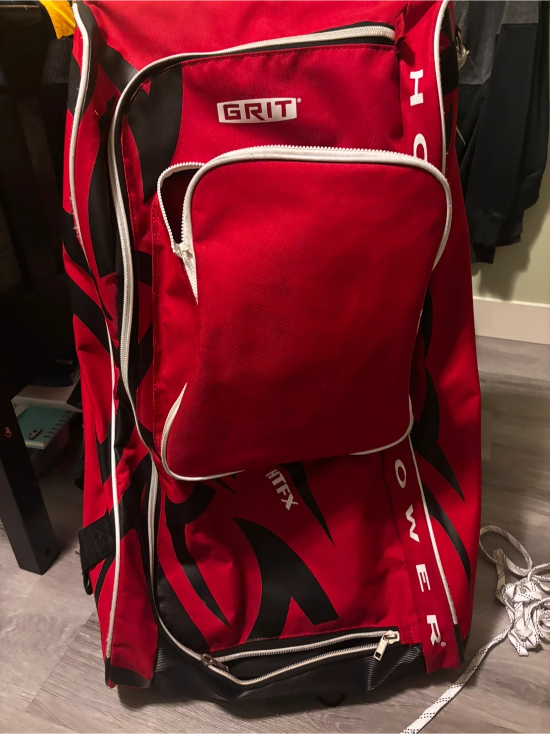 60Selling a Grit HTFX hockey tower bag in red and black. It's in good condition and ready to haul your gear to the rink! Has a small rip I’ve taped on back