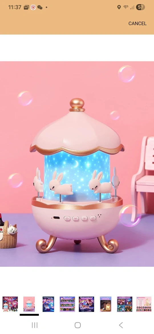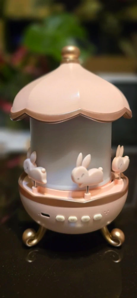 This pink projector night light creates a starry sky effect for kids' rooms. It features rotating bunnies and comes with multiple projection films for different patterns. Operates on 5V/1A with a 1200mAh battery capacity.