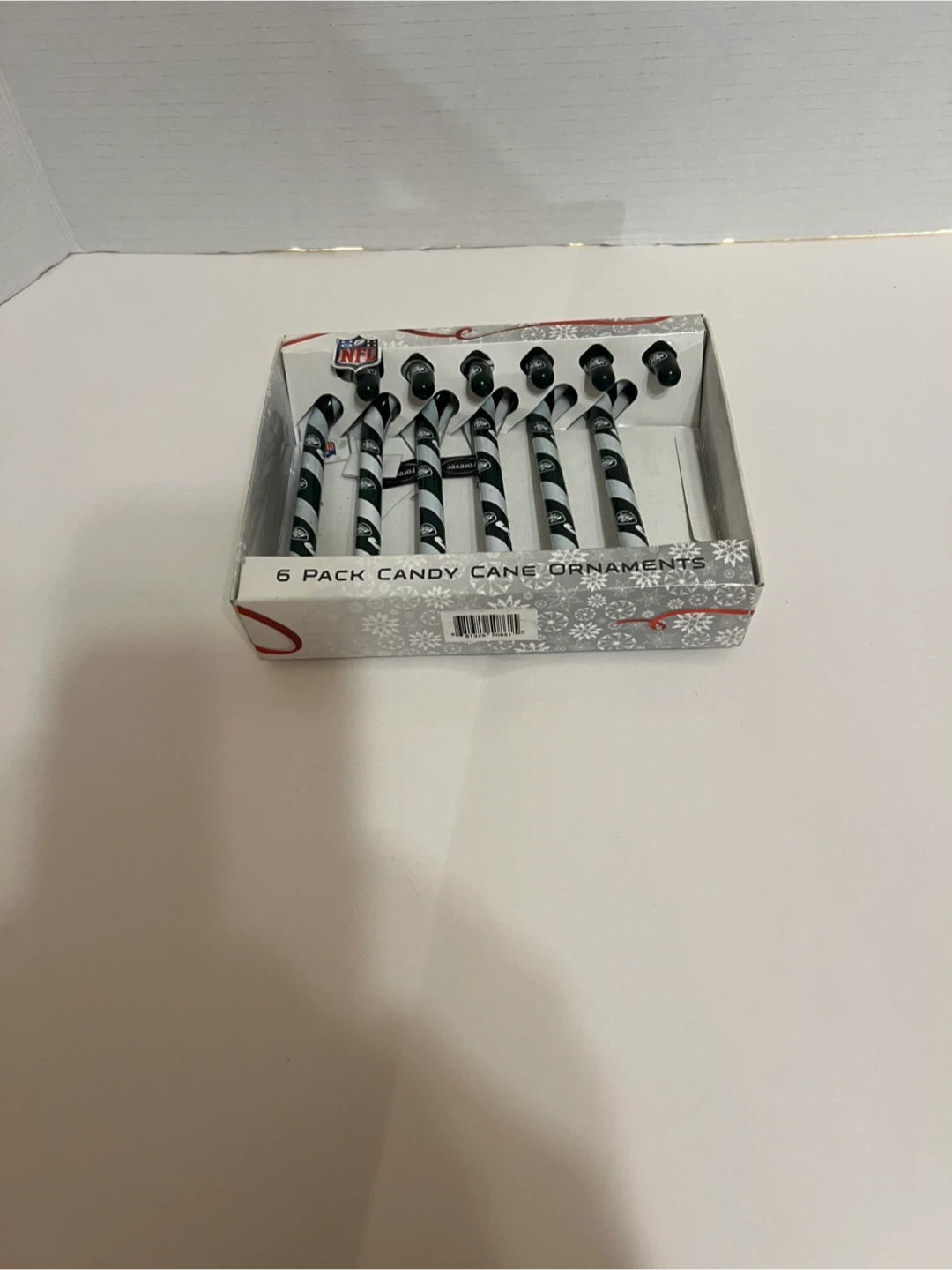 This is a 6-pack of NFL New York Jets candy cane Christmas ornaments.