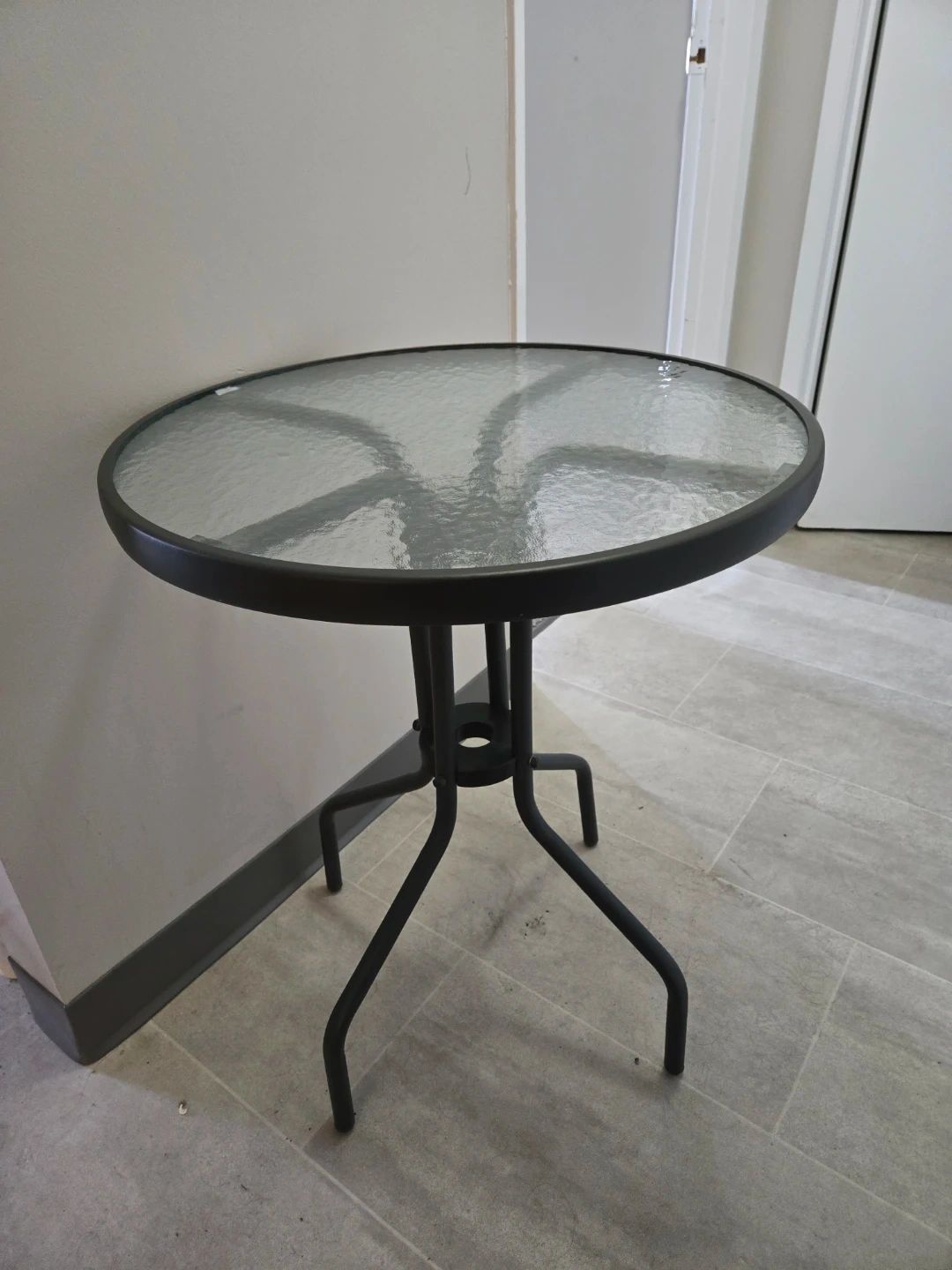 Round patio table with a textured glass top and metal base. This table is suitable for outdoor use. It's perfect for enjoying a morning coffee or a small outdoor gathering.