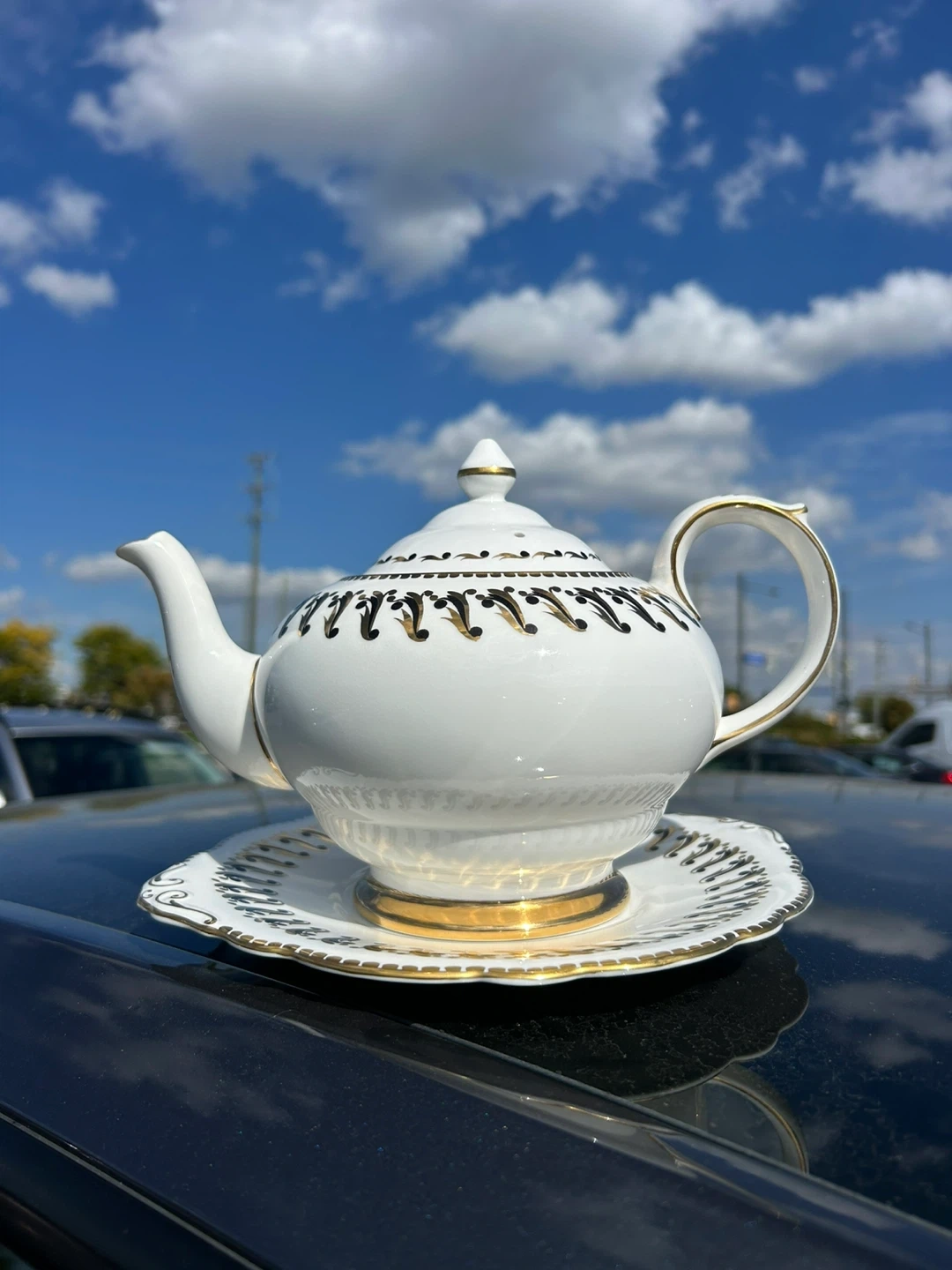 Selling a beautiful Grosvenor Bone China teapot with a matching plate. The teapot is white with gold accents and a delicate design. It's in great condition and would be a lovely addition to any tea set