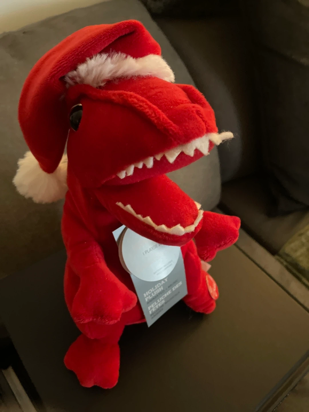 96Like new from non smoking home. This Christmas Dino growls! Makes an interesting decoration for the upcoming holidays! Takes 3 AA batteries.