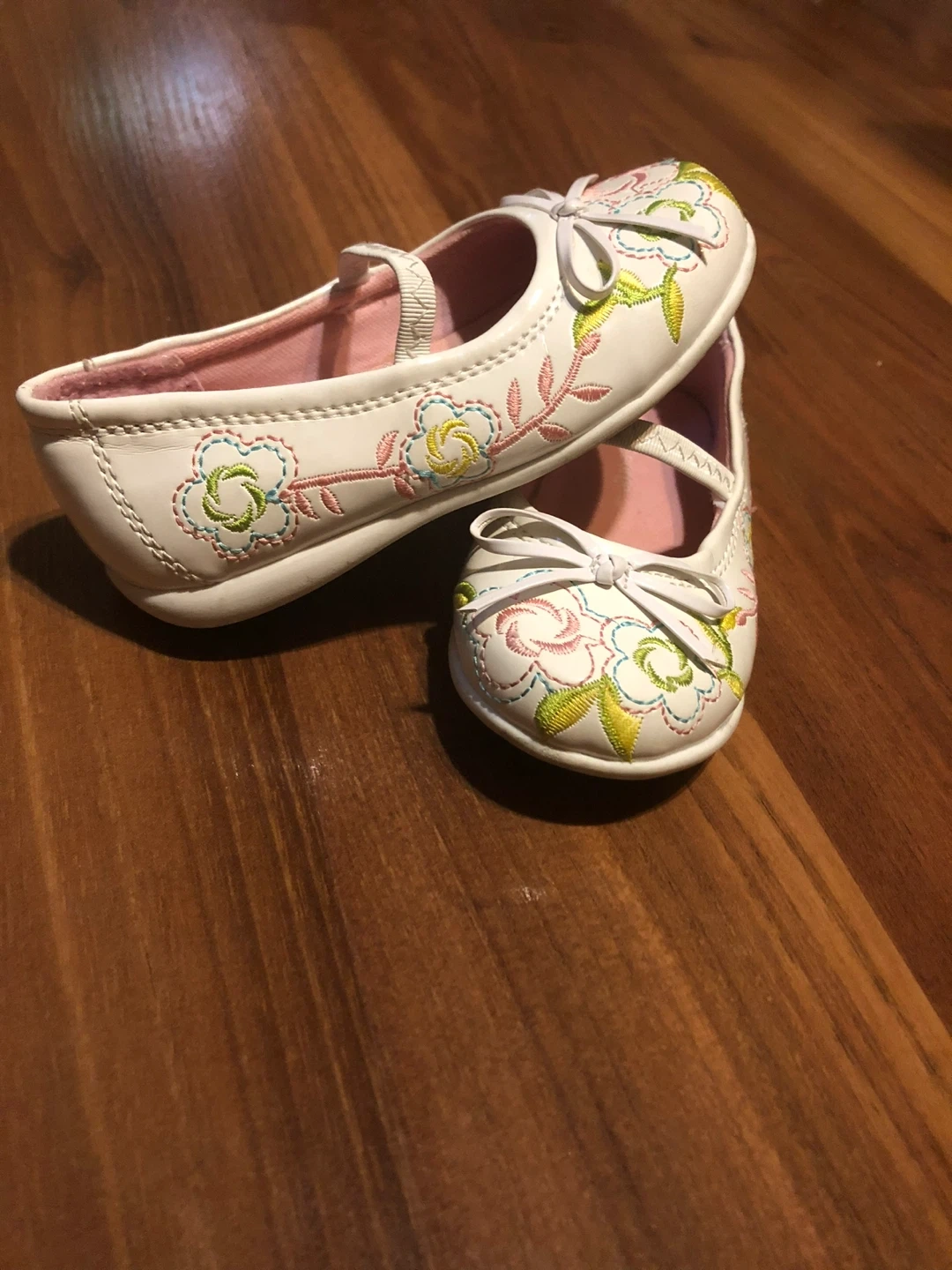 These cute white ballet flats from Cat & Jack feature a pretty floral embroidery design. They have a secure ankle strap and a soft pink lining. Toddler size 6.
