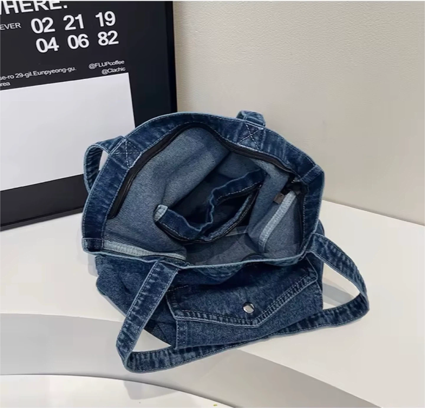 This classic tote bag is made from durable denim material. It features a handy front pocket and a secure zipper closure. It's spacious enough for everyday essentials!