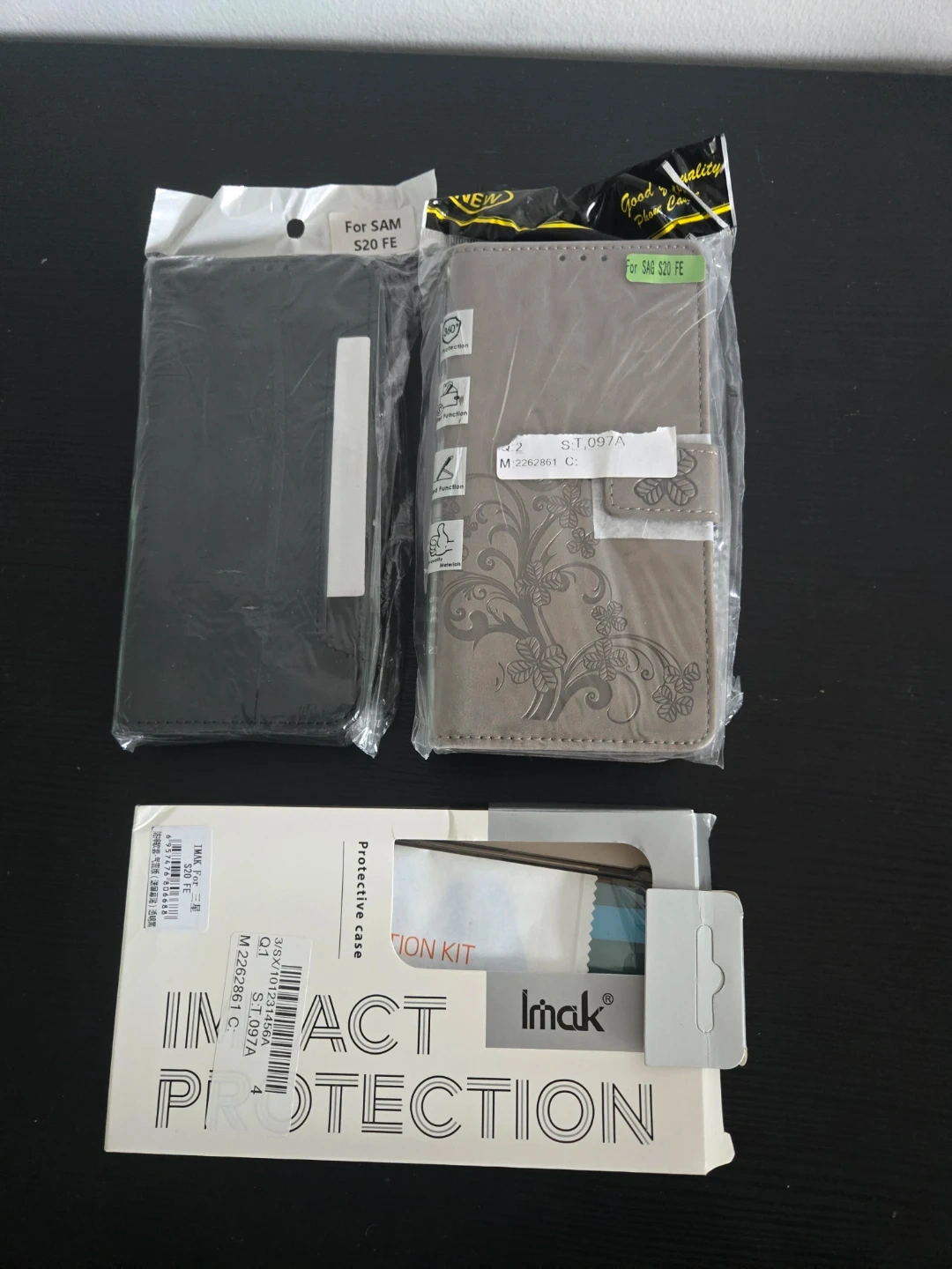 Two phone cases and an impact protection kit for Samsung S20 FE. Includes one black flip case and one taupe floral flip case. The kit has a screen protector and application tools.