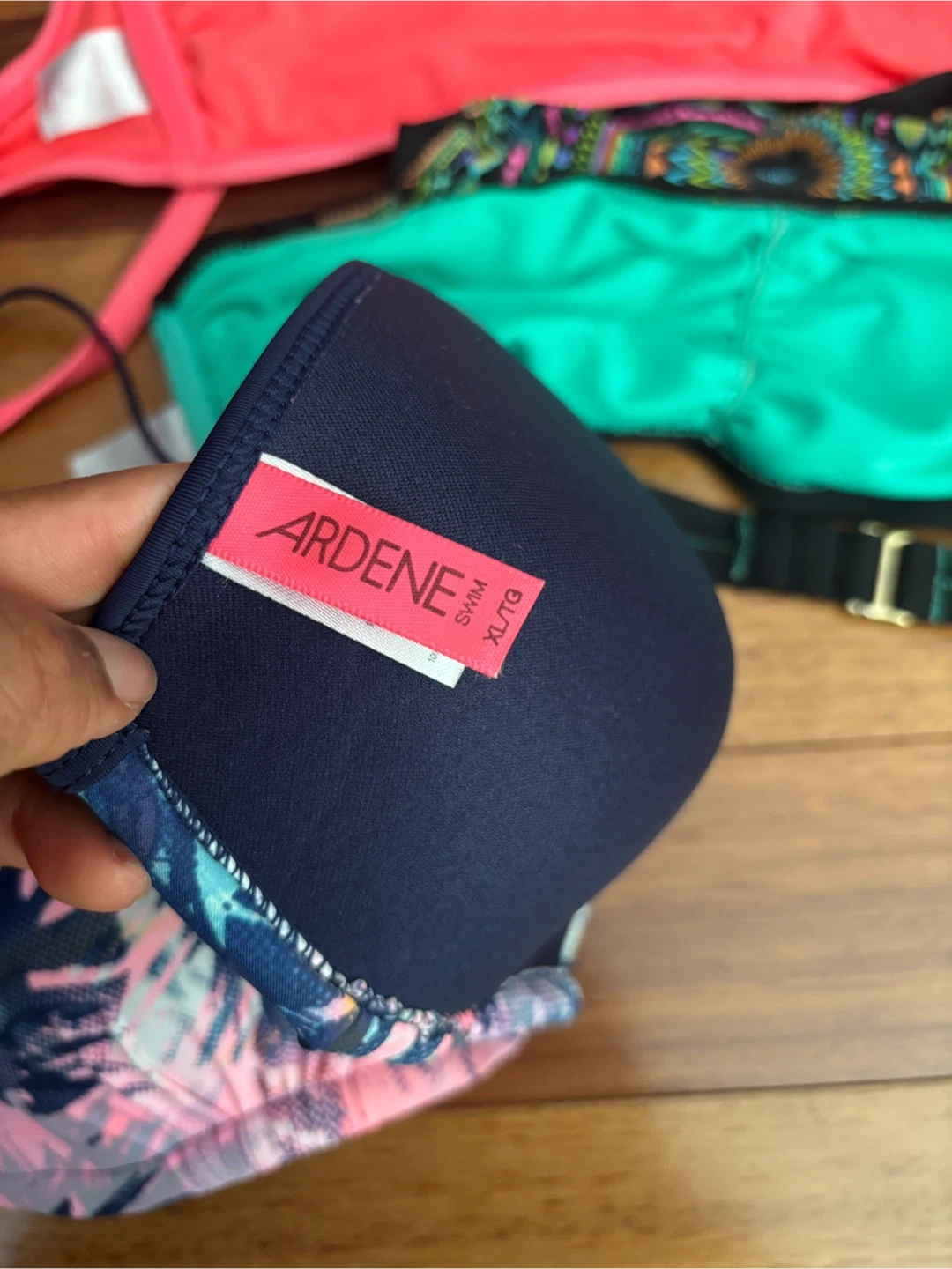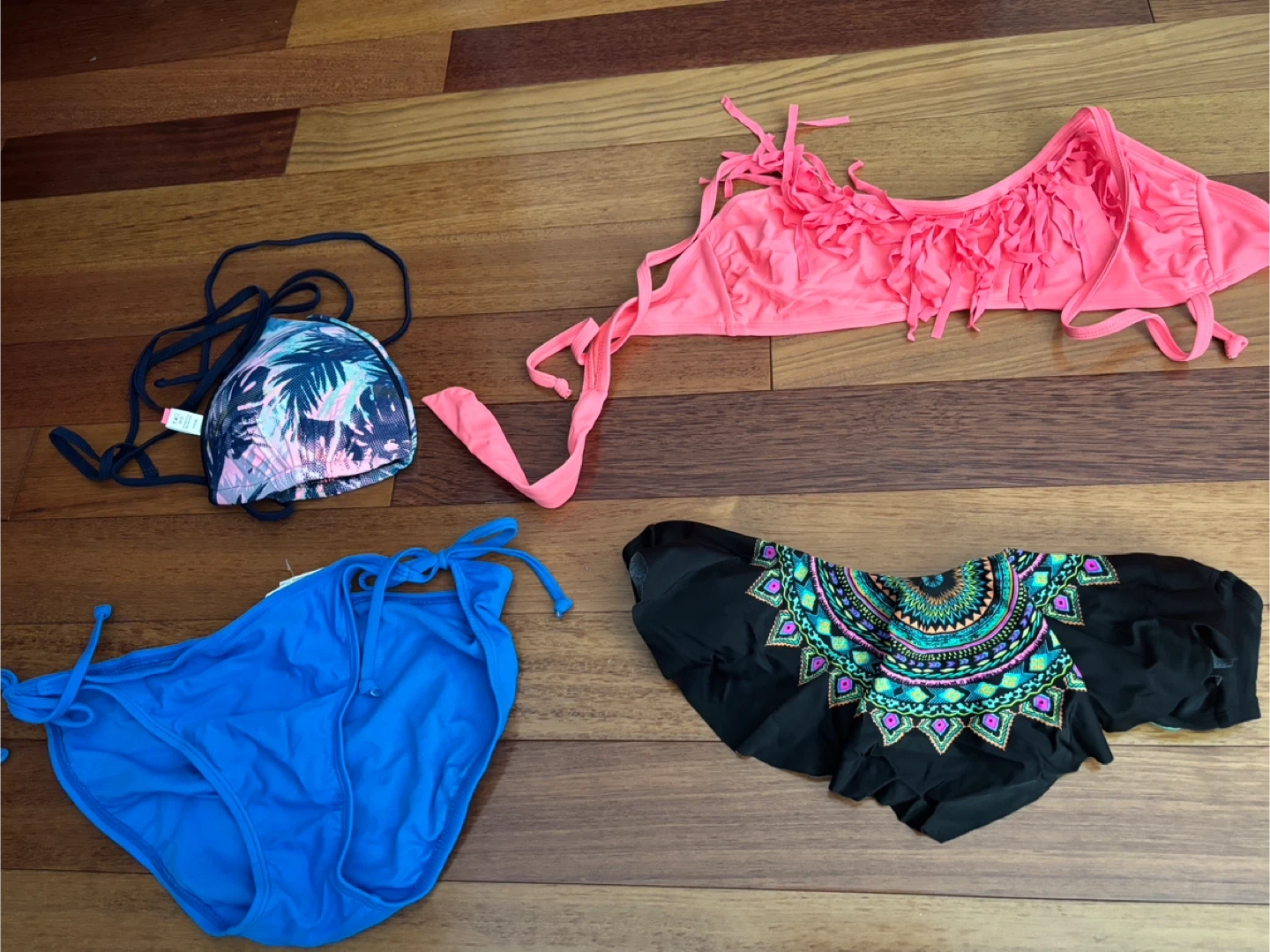 A collection of four bikini pieces including 3 tops and 1 bottoms. One pink /coral fringed top is size L/G. A teal bikini top is size L/G. A patterned bikini bottom is size XL ..A blue bikini bottom is size L/G