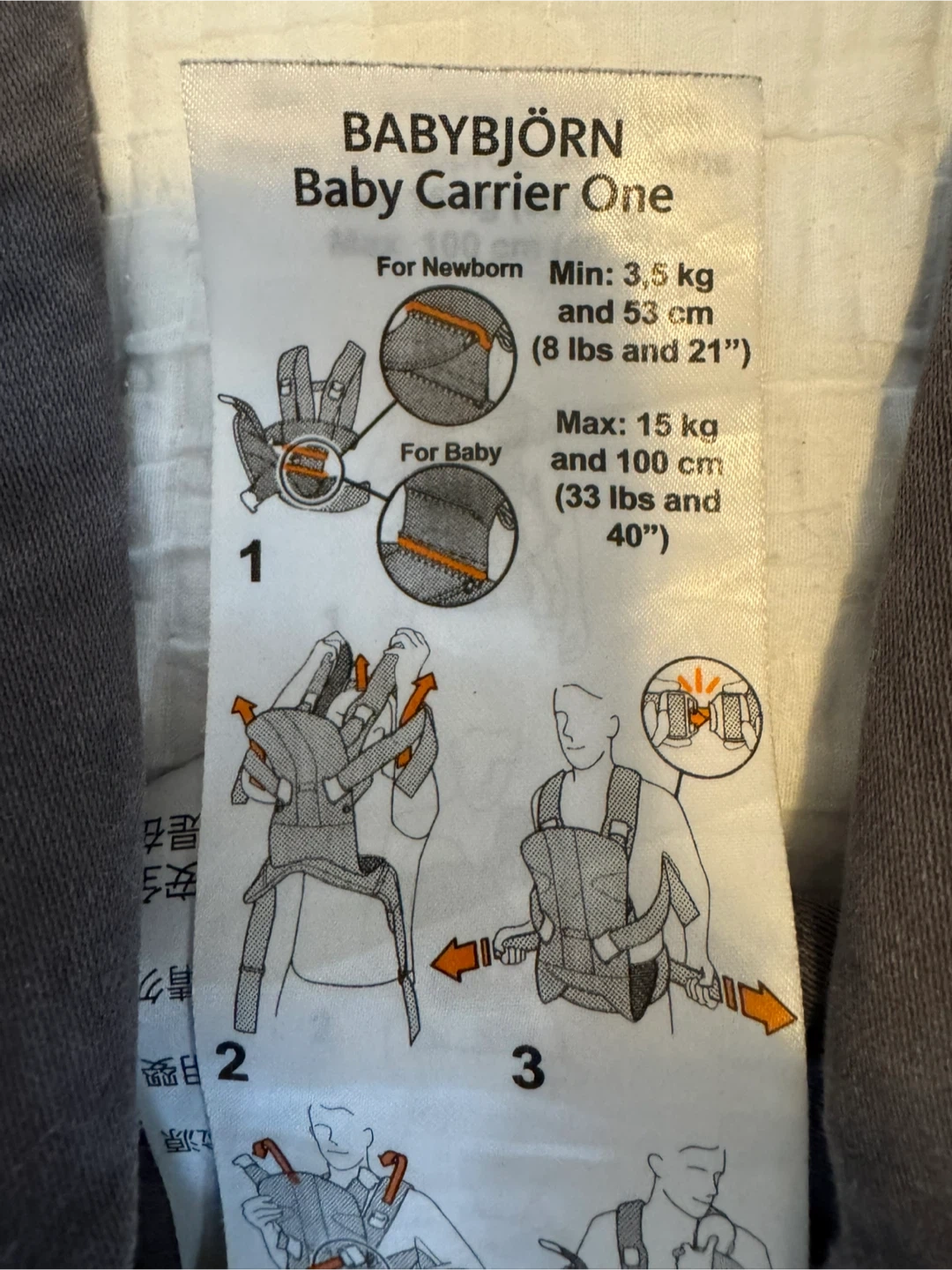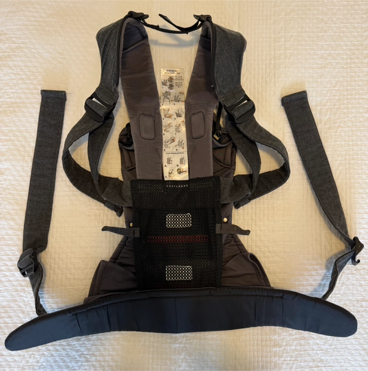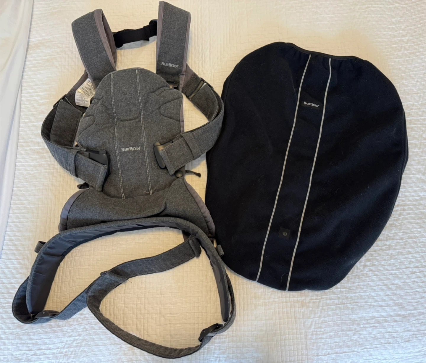 Selling our beloved BabyBjörn Baby Carrier One in Denim Grey Cotton Mix. Including a black soft cover for colder days.