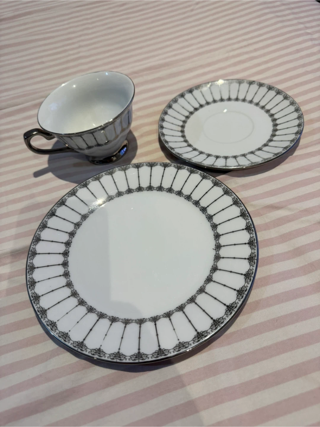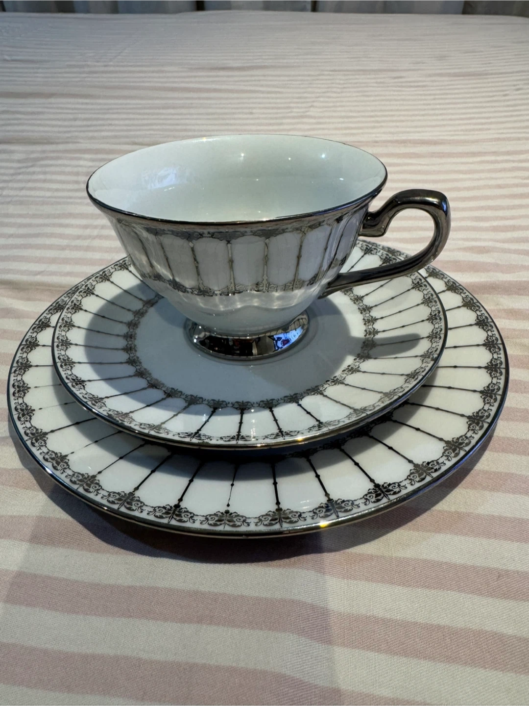 This elegant set includes a teacup, saucer, and side plate, all made from fine quality porcelain. It features metallic accents and a decorative rim. Hand wash is recommended for this delicate tableware.
