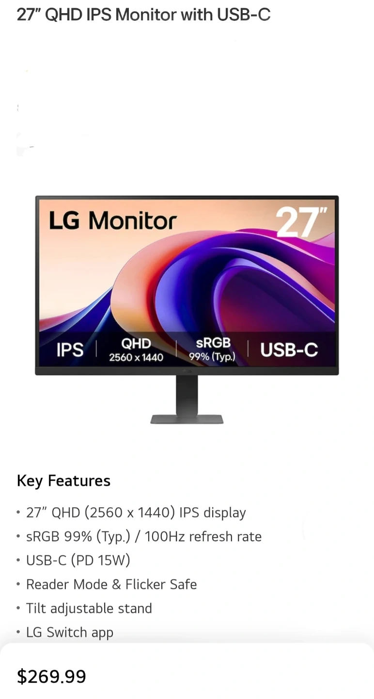 LG 27-inch QHD IPS monitor with USB-C connectivity. It features a 2560 x 1440 resolution, 100Hz refresh rate, and a tilt-adjustable stand. This monitor is great for detailed work and smooth visuals!