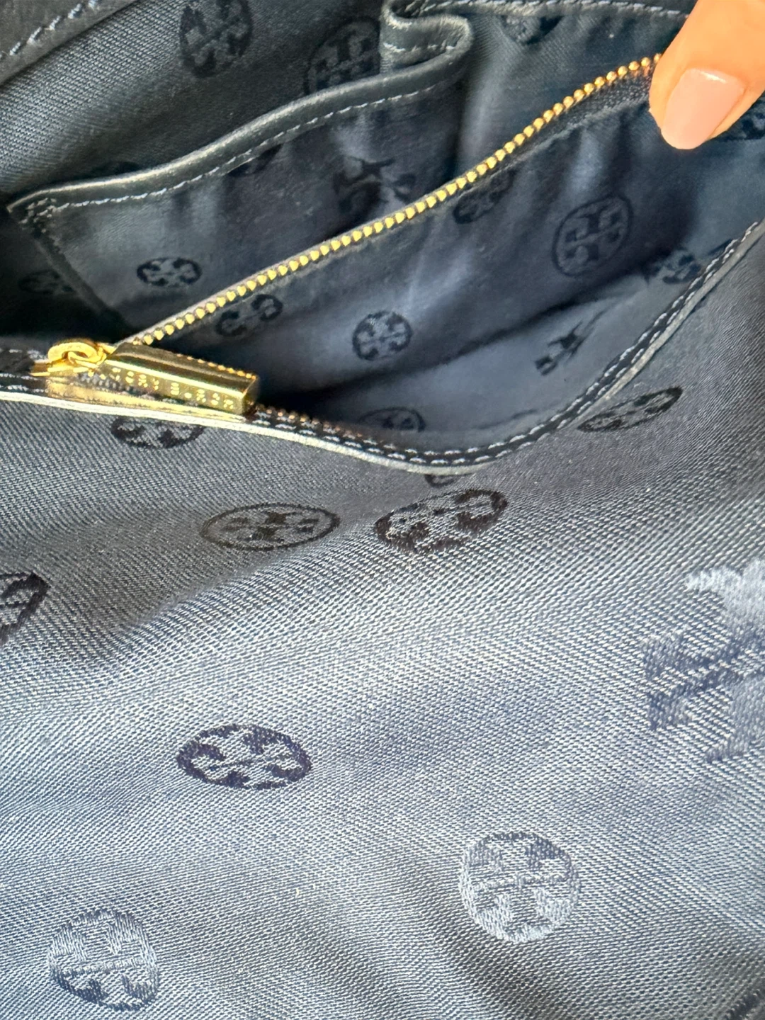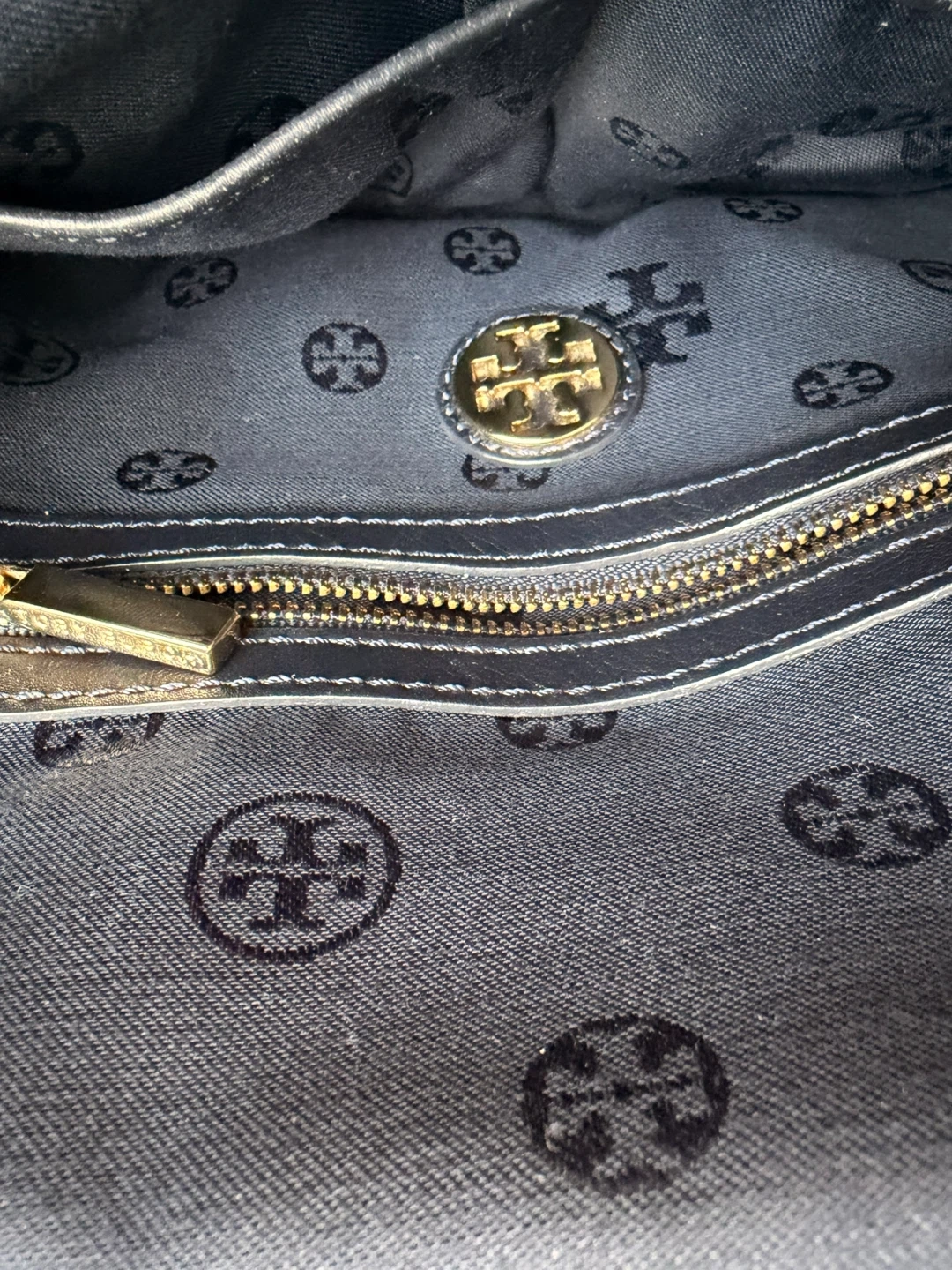 This Tory Burch bag is made of dark blue leather. It features the signature Tory Burch logo on the front and a patterned interior lining with a zippered pocket. A classic and stylish addition to any outfit!