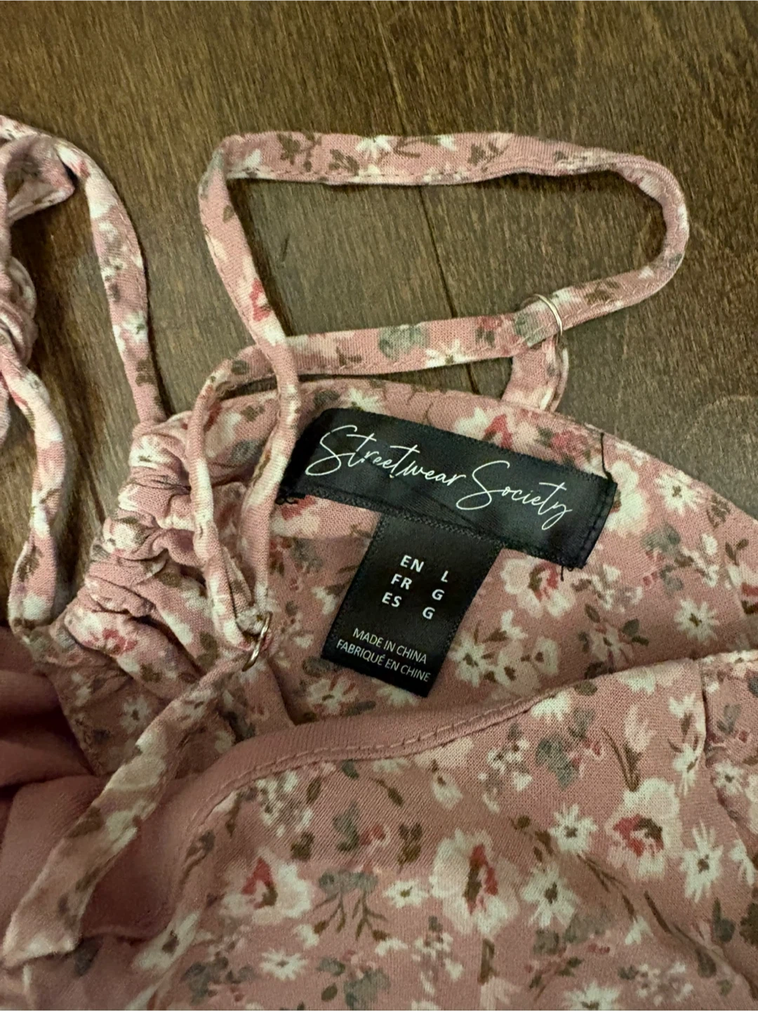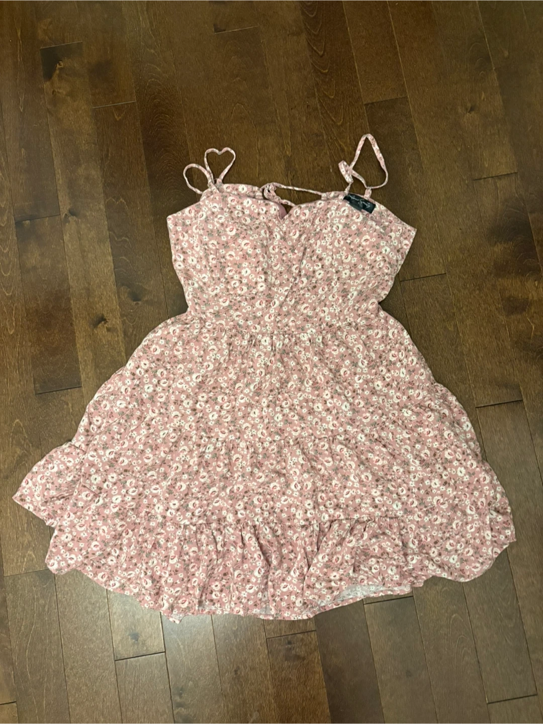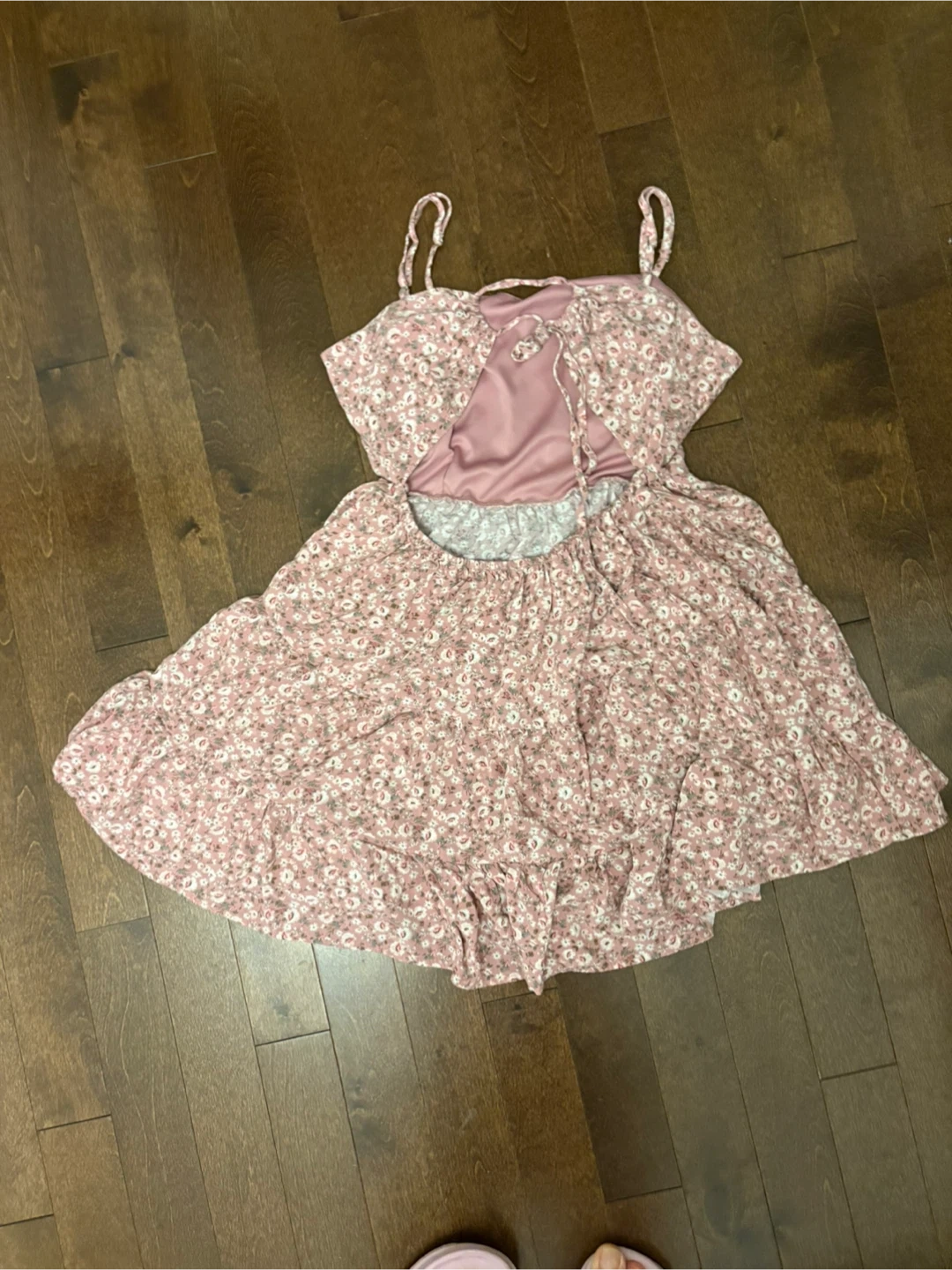 Sweet pink mini dress with a delicate floral pattern. It features adjustable spaghetti straps and a ruffled hem. The back has a tie closure and a cut-out detail. Size large but fits more like a medium.