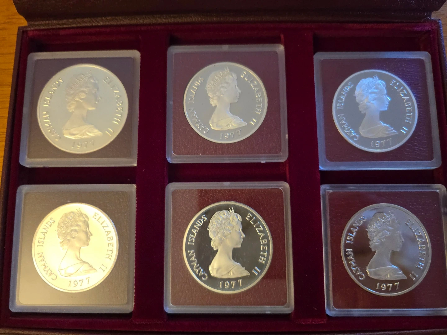 This is a 1977 Cayman Islands Silver Queens Collection. It includes five $25 silver coins and one $50 silver coin. The coins were minted by the Royal Canadian Mint. They were issued only for Queen Elizabeth's Jubilee year. The collection is composed of .925 silver and has a total actual silver weight of over 9.5 ounces.