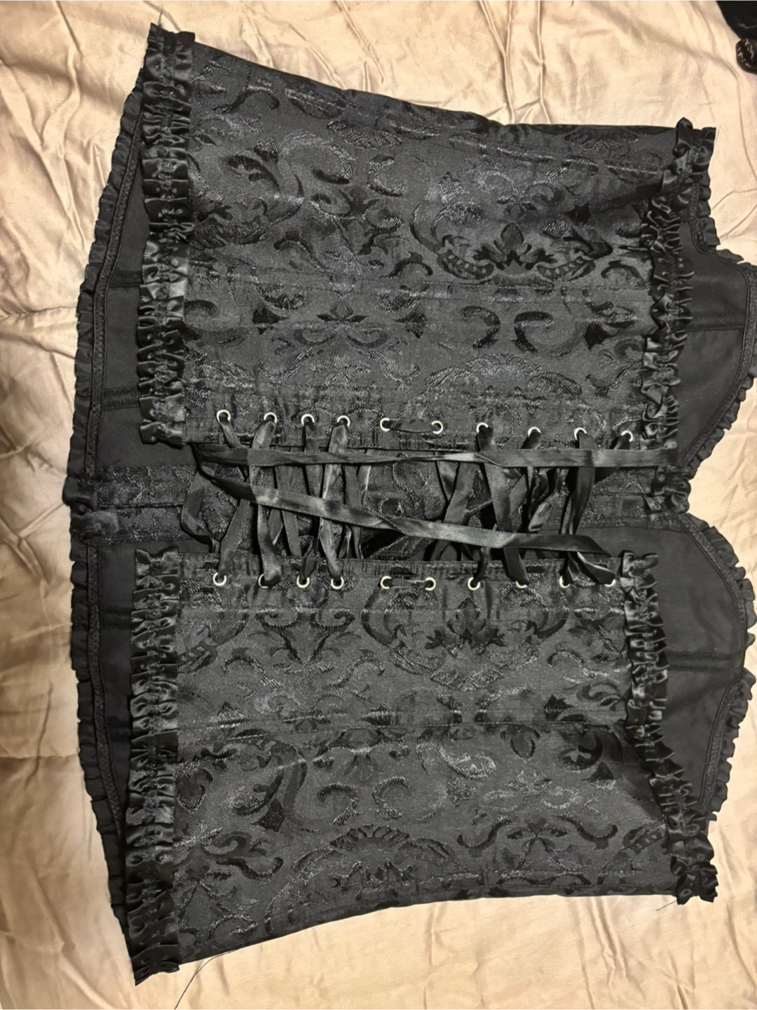 Selling a black corset top in size 4XL. The material is 90% polyester and 10% spandex. It has a beautiful floral pattern and ruffle trim. Perfect for a night out or adding a touch of elegance to any outfit!