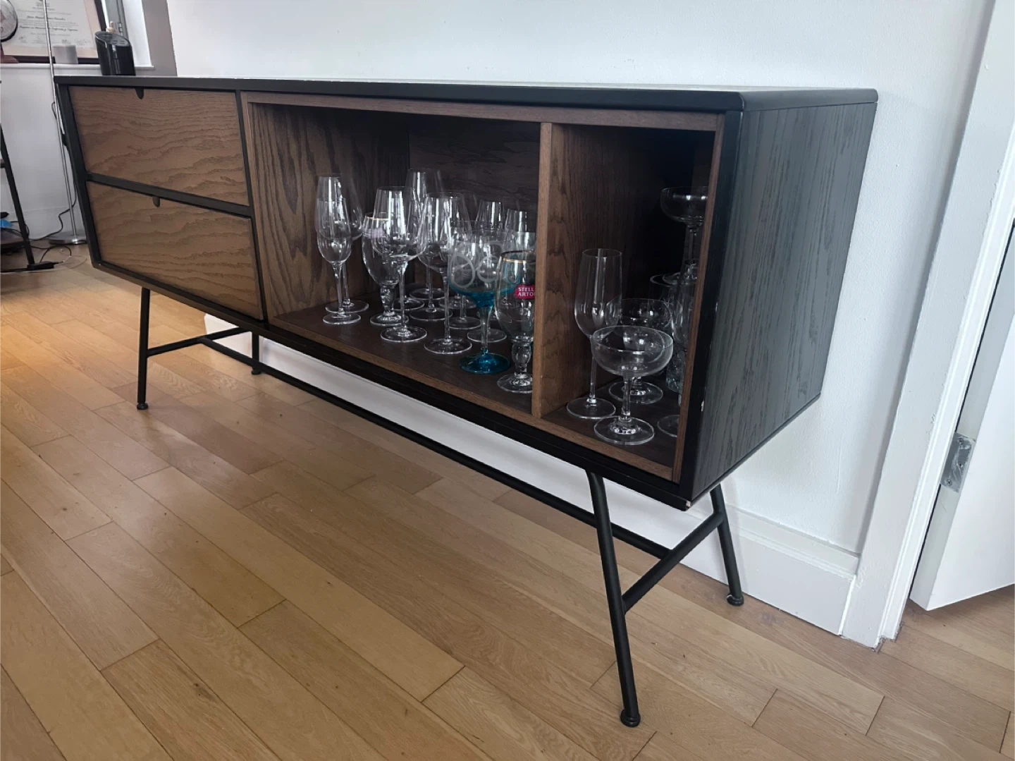 This stylish sideboard features a dark wood veneer finish with natural oak drawer fronts and an open shelving section. It's supported by sleek black metal legs, offering ample storage and display space. The unit includes two drawers and a divided open compartment, perfect for organizing essentials or showcasing glassware.