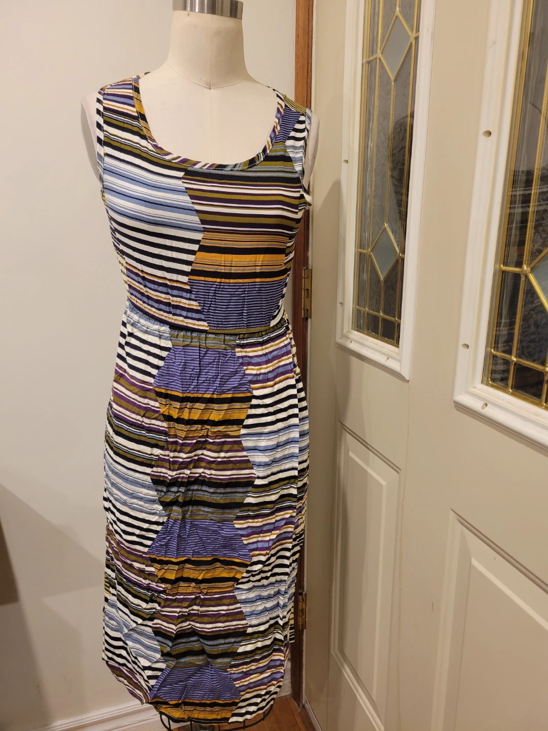 This colourful striped sleeveless maxi dress size small features a gathered waist. It's made from a soft, stretchy fabric. It's great for casual wear or a day out! Meetup location eglinton and dufferin area