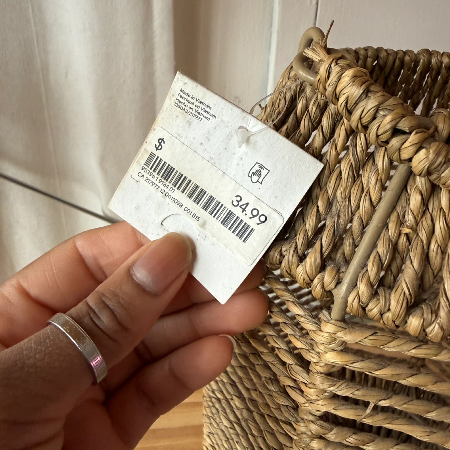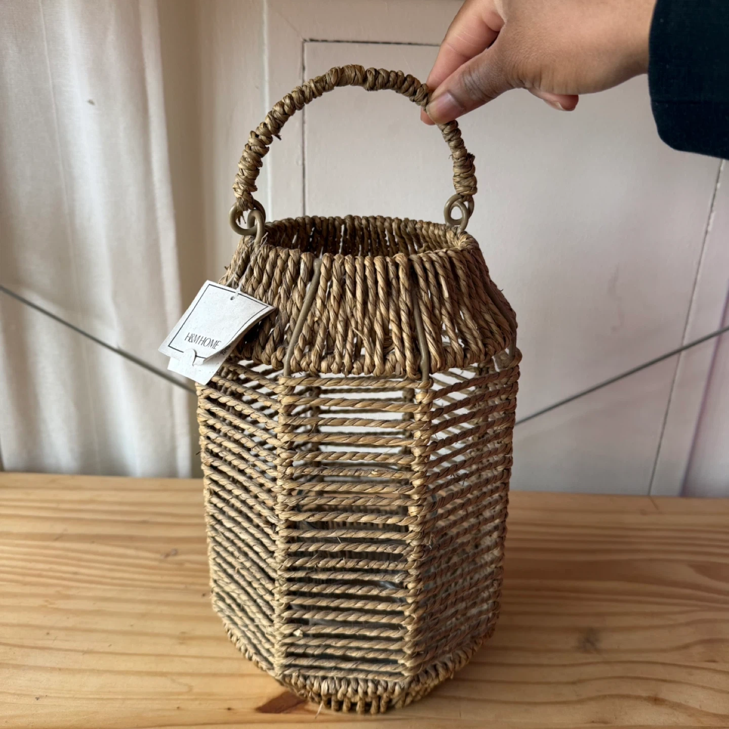 This H&M Home lantern is made of woven natural fibres with a glass insert. It's perfect for adding a cozy ambiance to any room or patio. The lantern includes a clear glass candle holder.