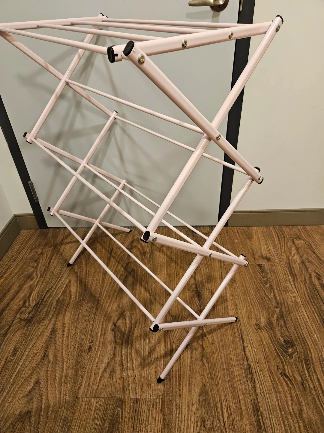 Light pink metal drying rack for laundry. Great for use in a dorm or extra drying space at home! Still works perfectly, just some minor paint chips. Roughly 38in tall and 28.5in wide. Collapses/folds for easy storage.