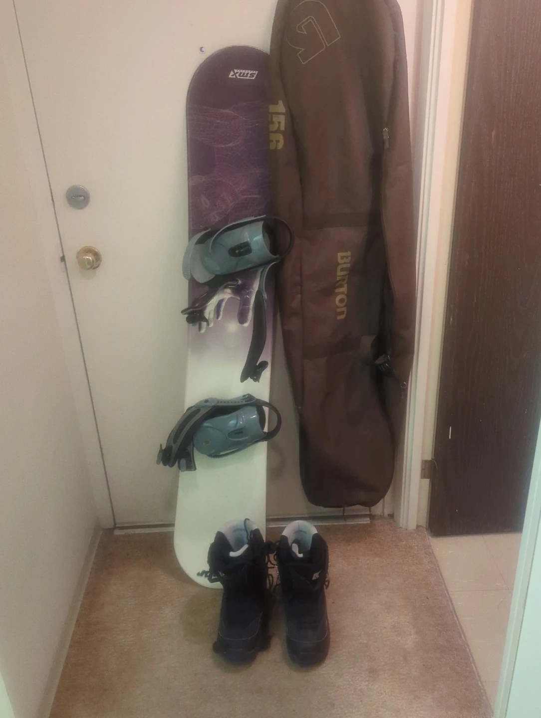 This set includes an XWS snowboard, size 156, and a Burton snowboard bag. A pair of black snowboard boots are also included. Ready for your next mountain adventure! The boots have been worn only 2 times I also have some snowboarding gloves and a neck warmer I will throw in.