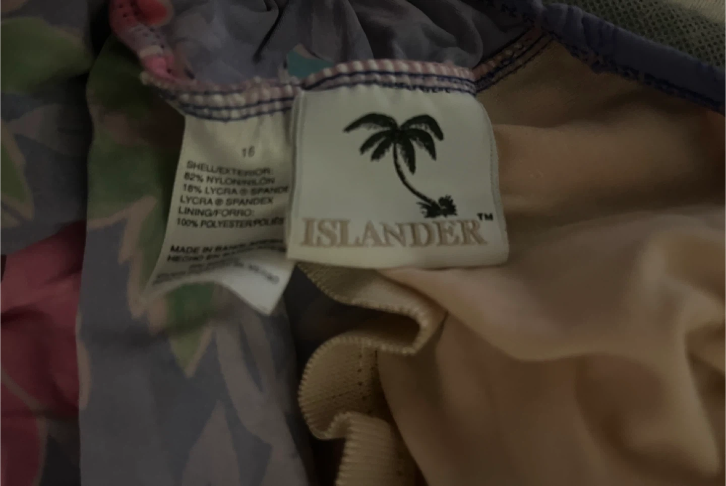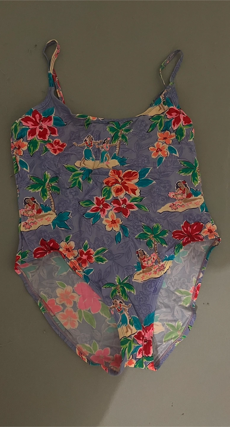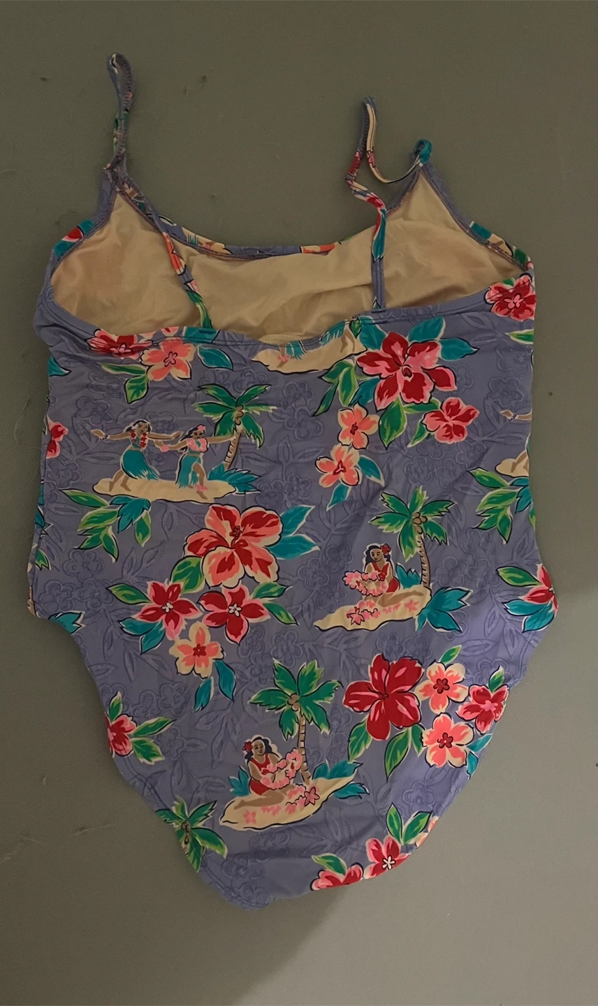 This Islander one-piece swimsuit features a fun floral and hula girl print on a light blue background. It's made from a nylon and spandex blend for a comfortable fit. The lining is polyester. Size 16 (XL)