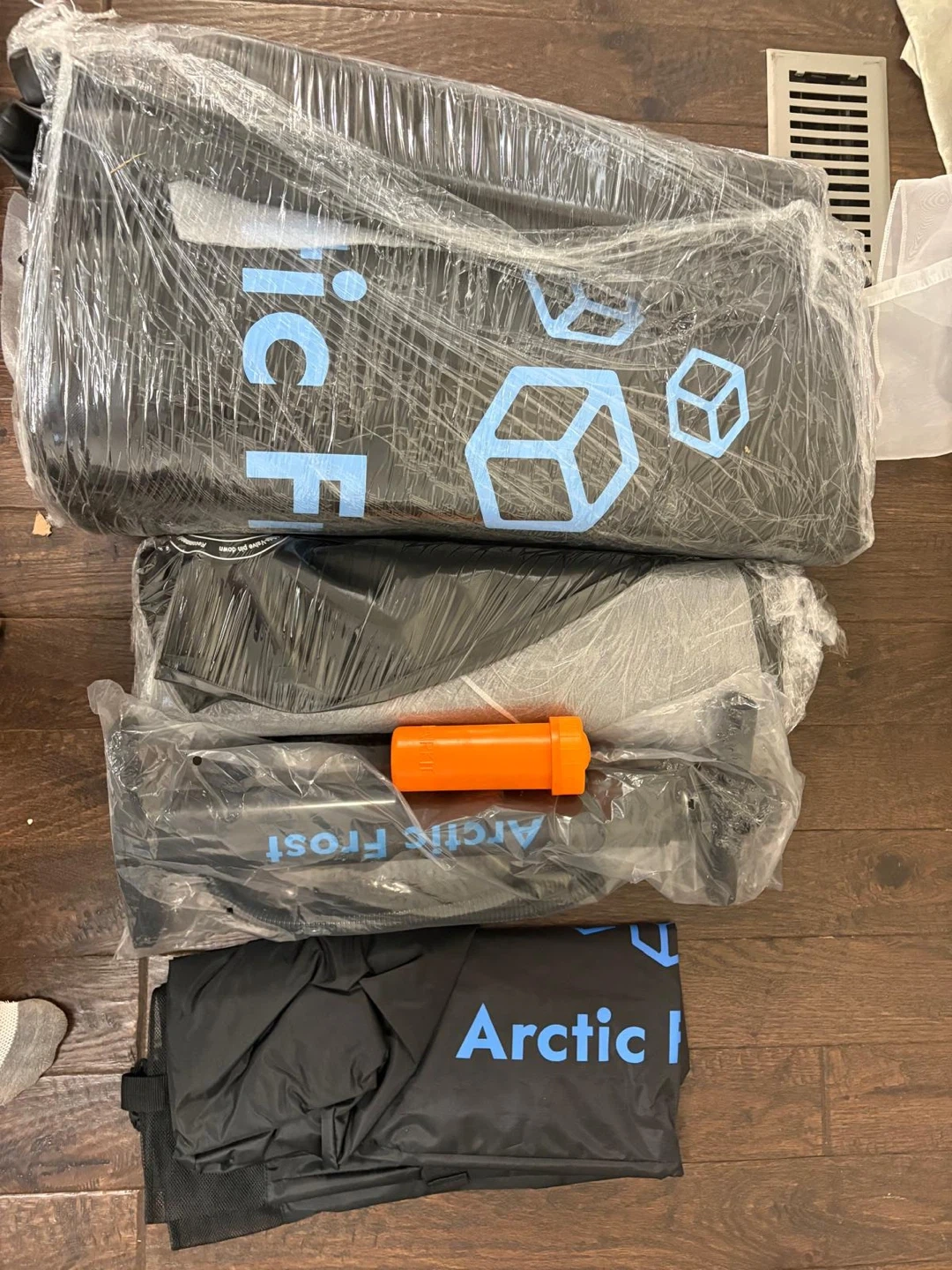 Arctic Frost inflatable ice bath tub. It comes with an air pump and a storage bag. Setup instructions are included.