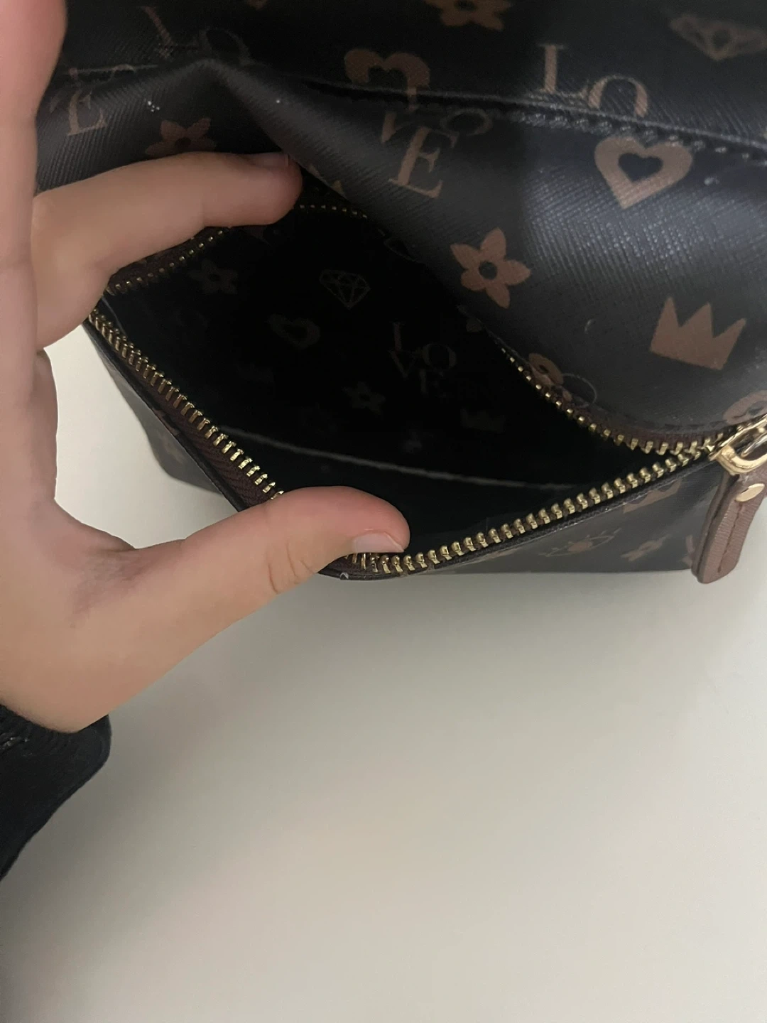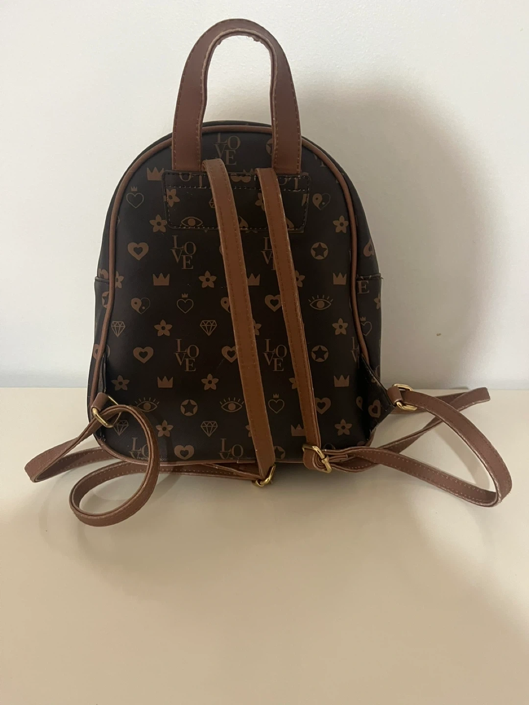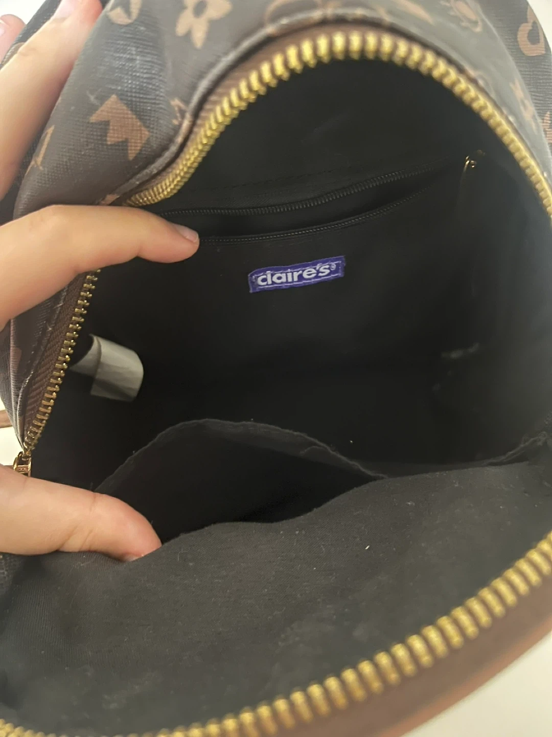 This is a cute mini backpack from Claire's! It features a dark brown colour with a fun all-over print. Perfect for carrying your essentials in style!