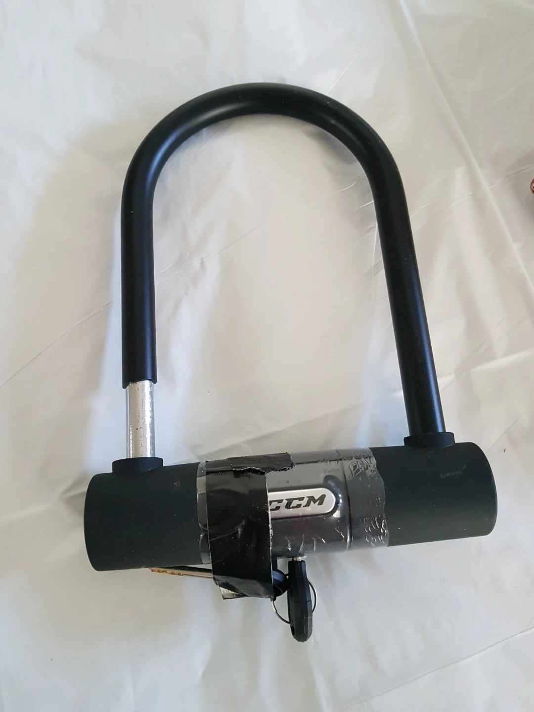 This is a CCM U-lock designed to secure your bicycle. It comes with two keys. Heavy-duty steel construction provides good security.