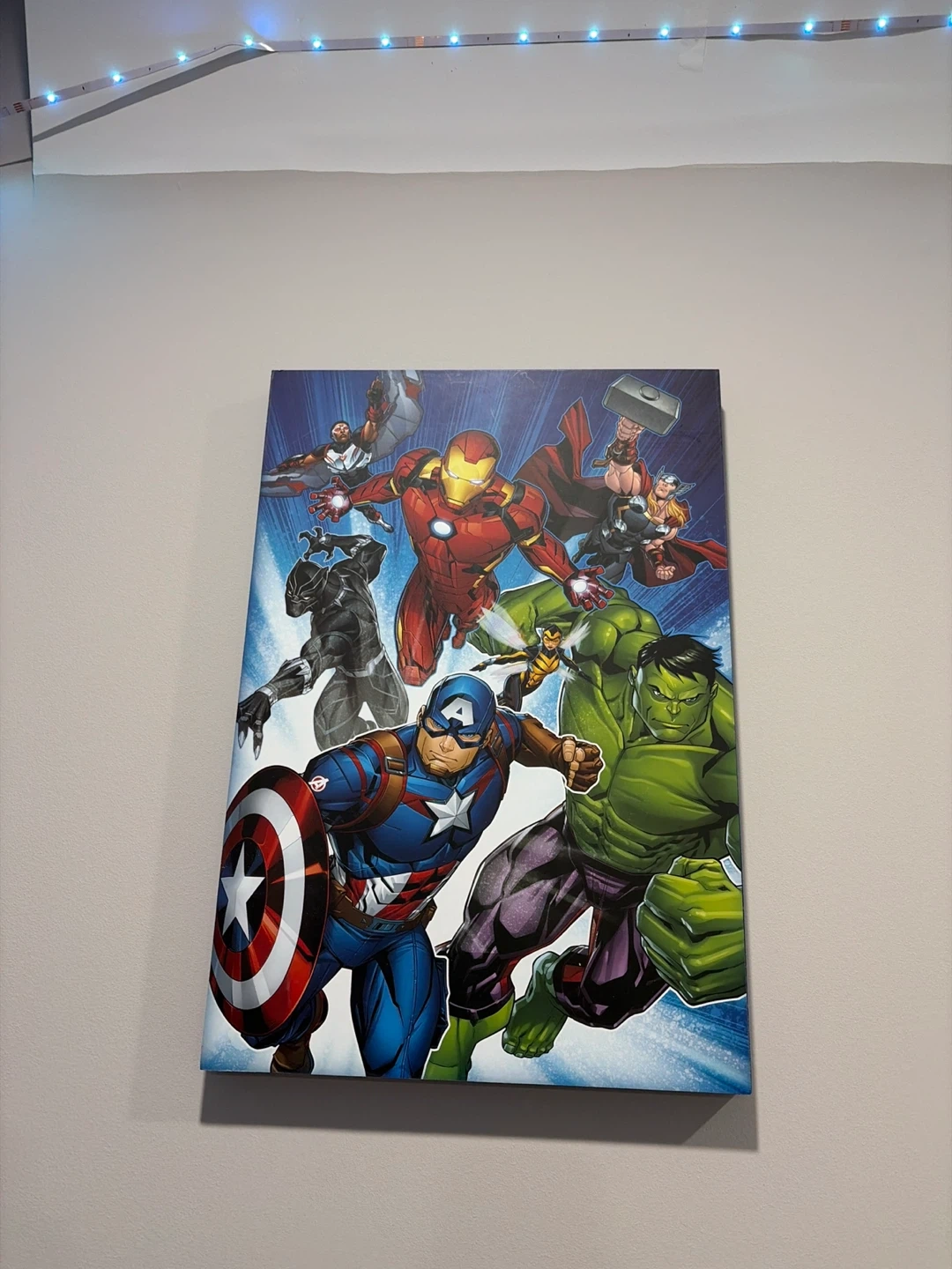 This canvas print features a dynamic illustration of popular Marvel Avengers characters. It's perfect for adding a touch of superhero flair to any room. The vibrant colours and detailed artwork make it a great piece for any fan!