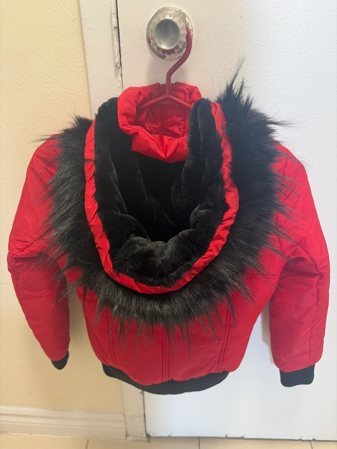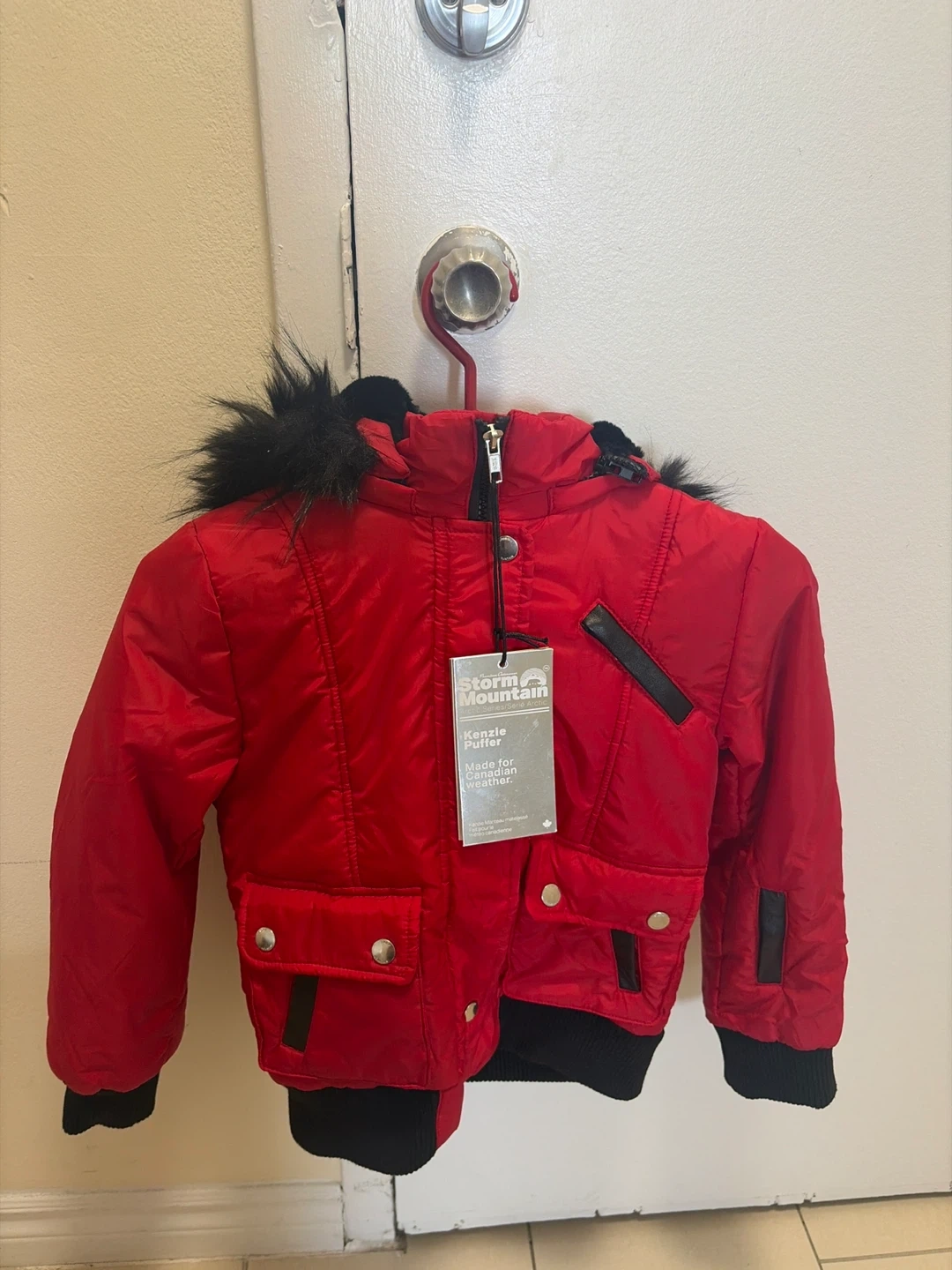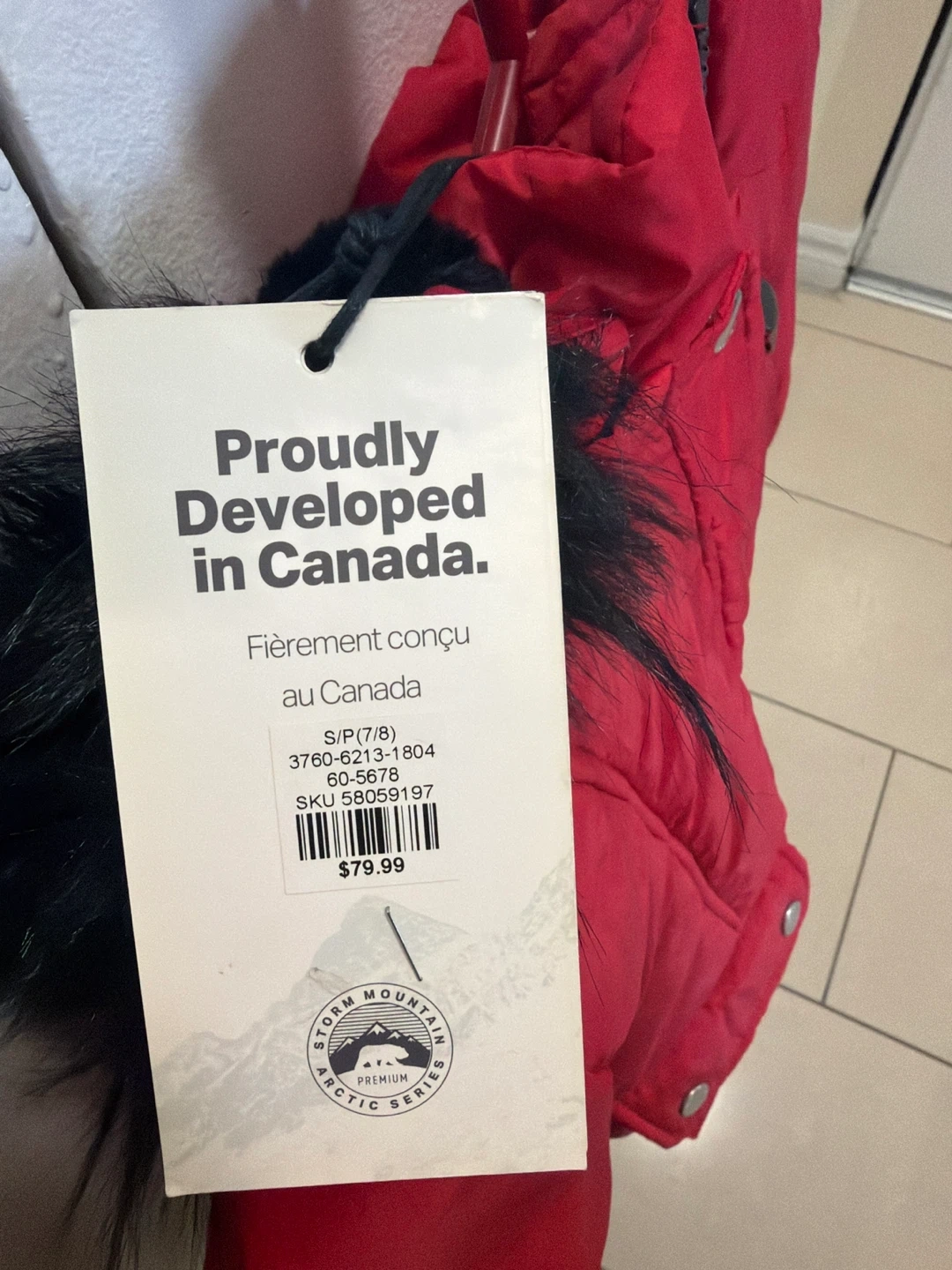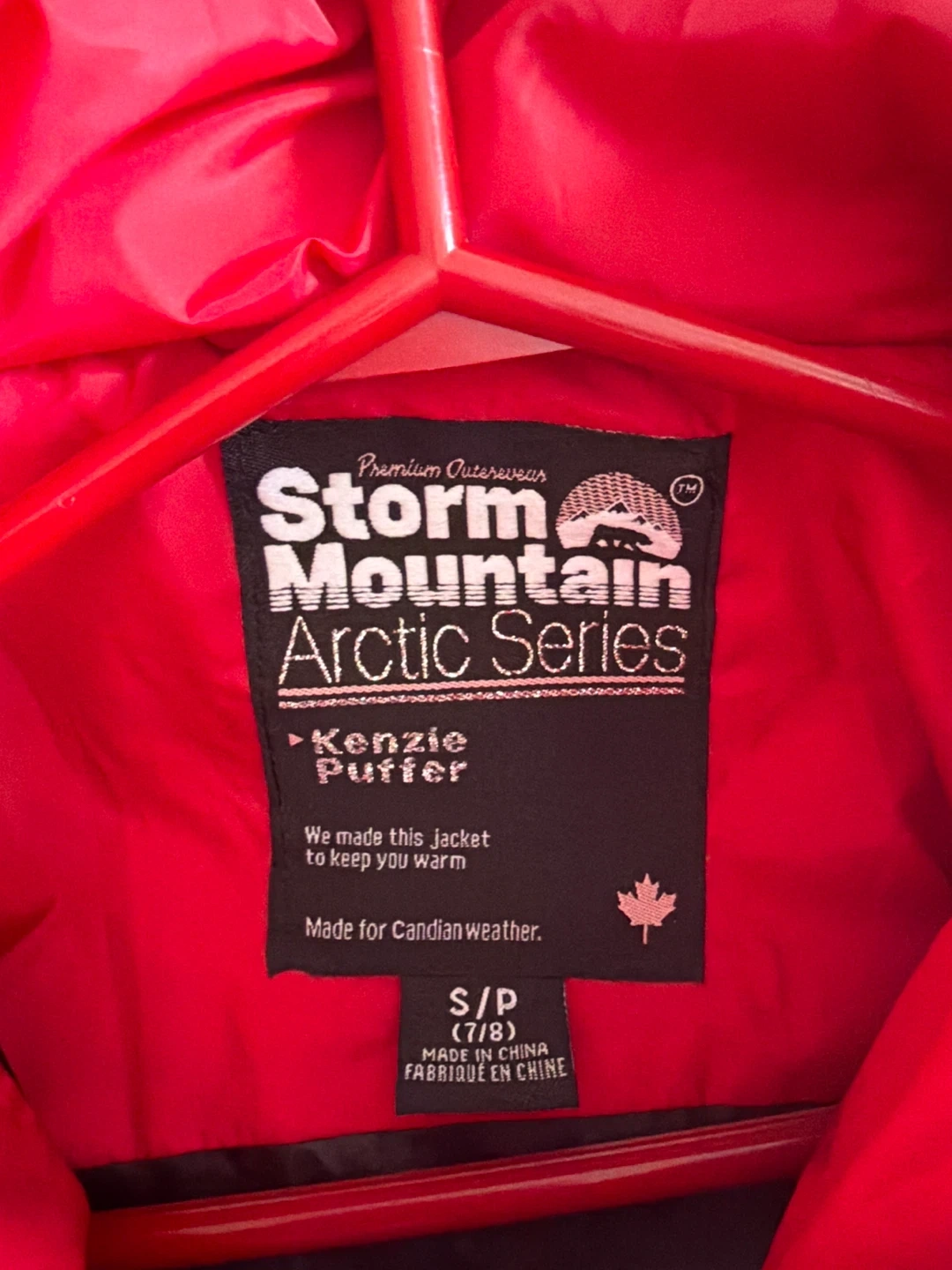 This Storm Mountain Arctic Series Kenzie Puffer jacket is made for Canadian weather. It's a size S/P (7/8) with a red exterior and black trim. The hood is lined with faux fur. It's proudly developed in Canada and was originally priced at $79.99.