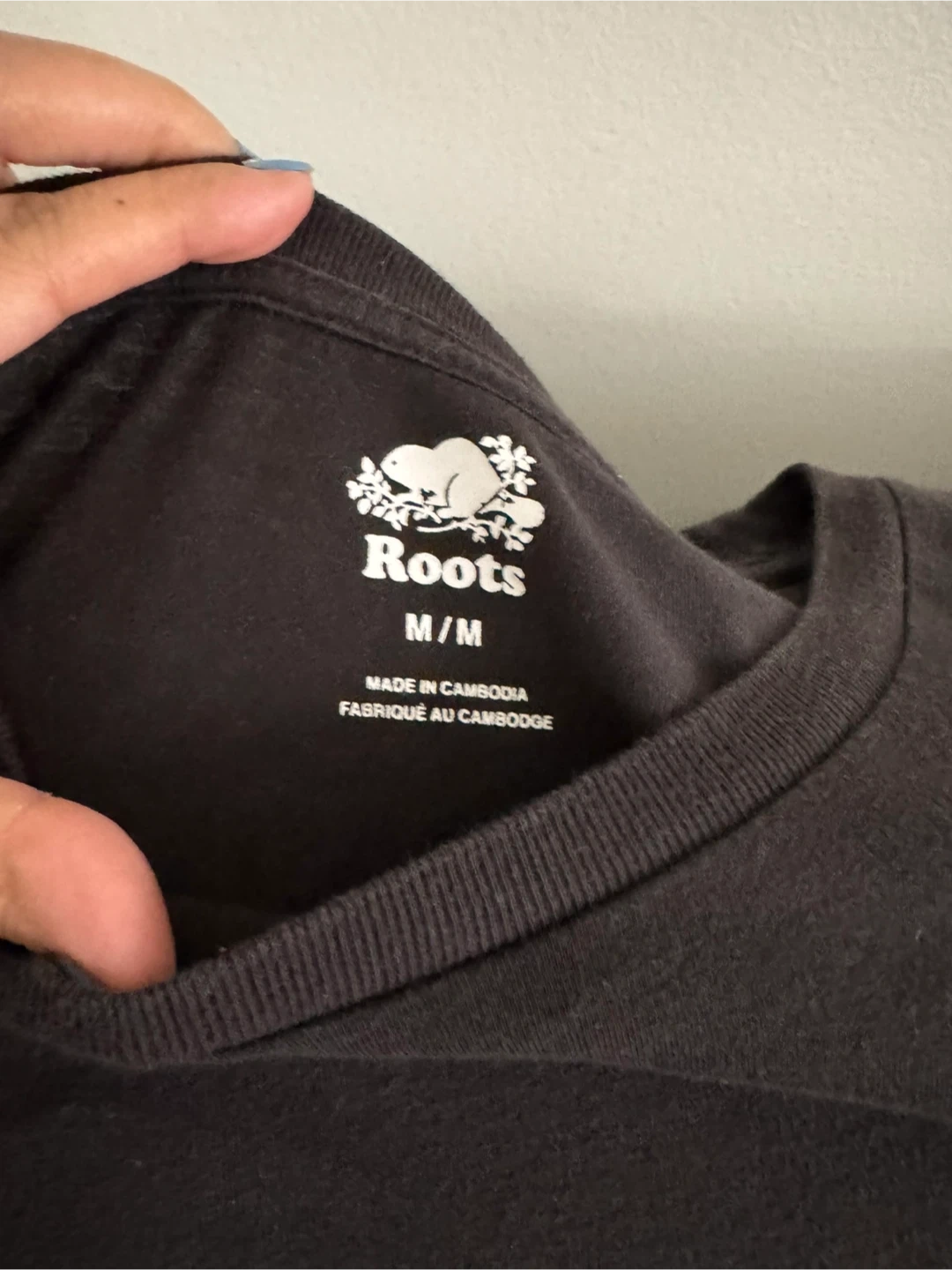 Black long sleeve t-shirt from Roots Canada. It's a size medium/M. The shirt has graphic detailing on the sleeves and a logo on the front.