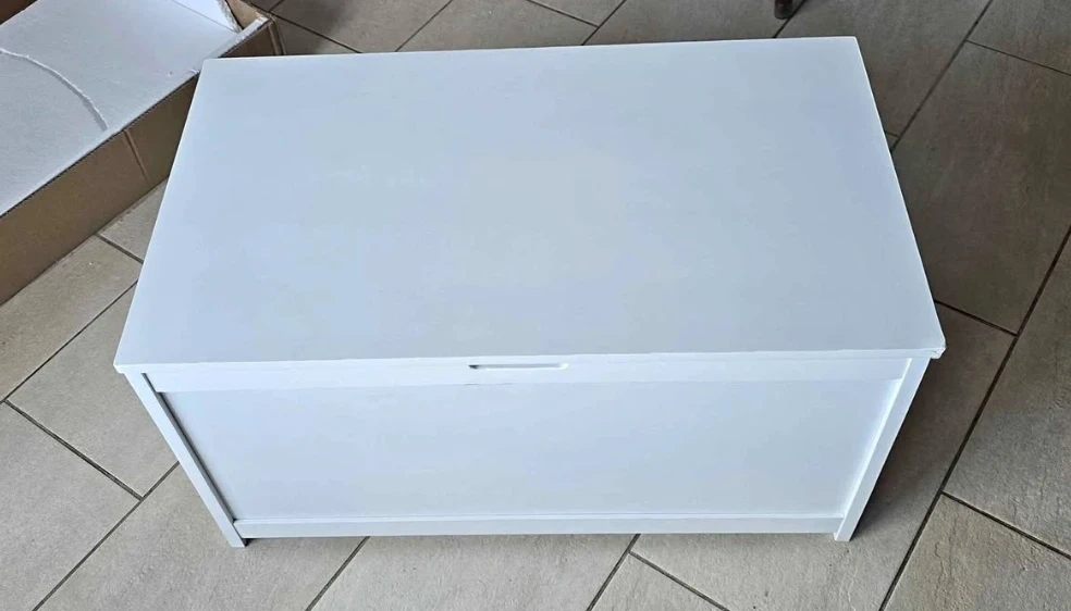 This Child Craft Harmony toy box is 33 inches wide and made of wood with a matte white finish. It features 2 safety hinges for a soft close and a standard ventilation hole on the back. Plenty of space with 6 cubic feet of storage.