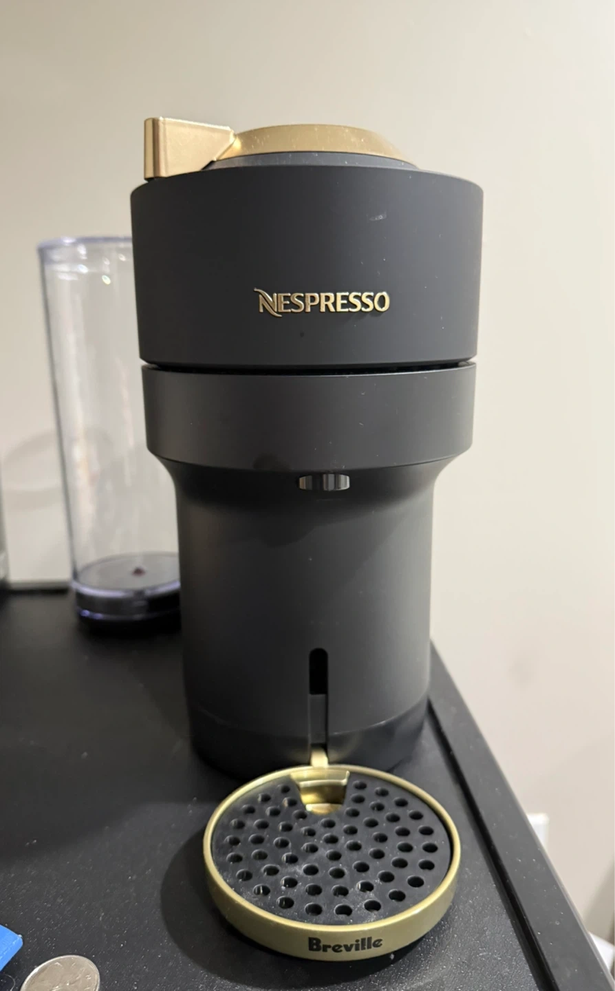 This Nespresso VertuoPlus machine brews delicious coffee. It comes with a water tank and a used capsule container. Double-walled glass mugs are also included, perfect for enjoying your hot beverages!