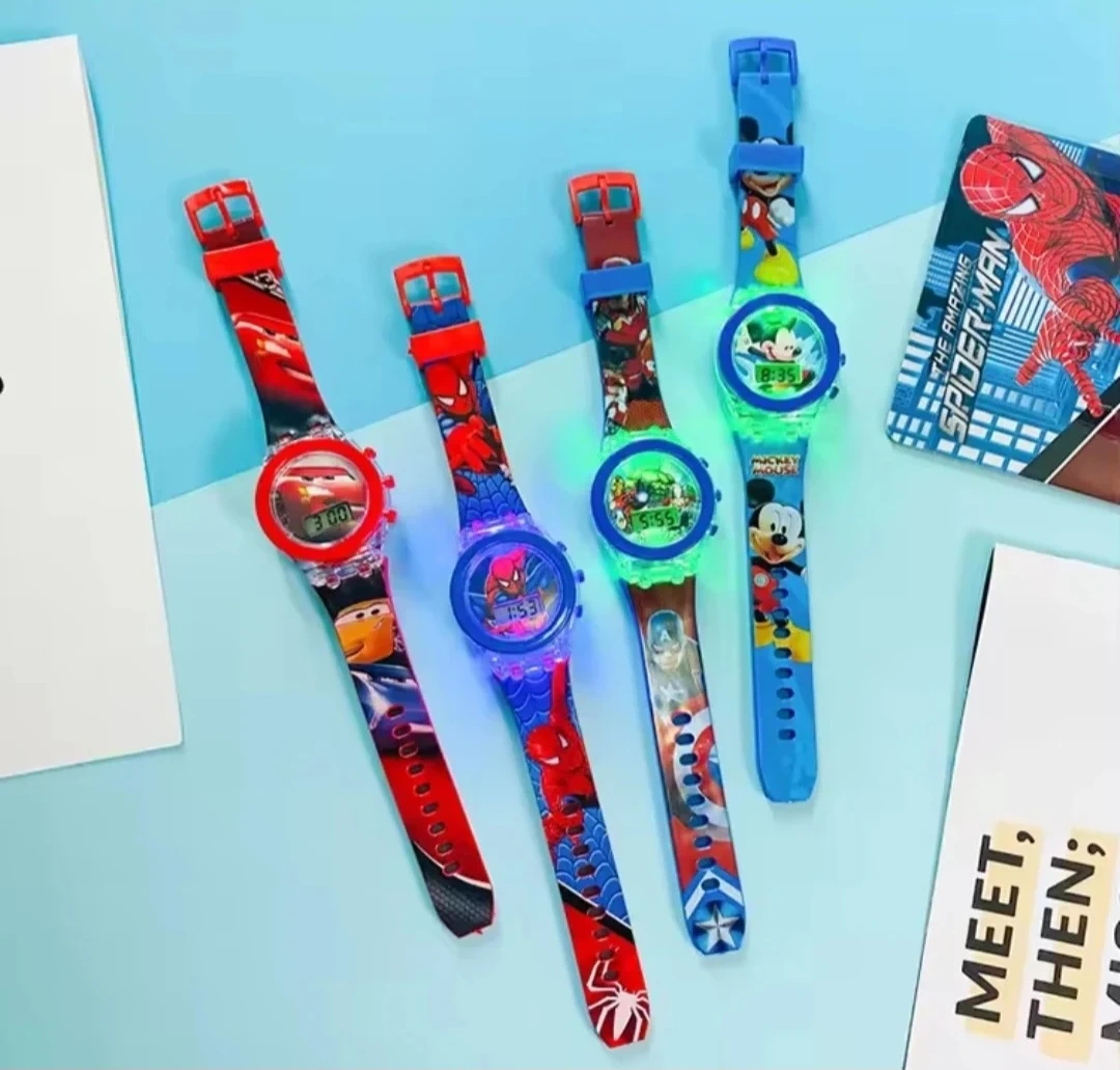 Set of four digital watches for kids featuring popular characters like Spiderman, Mickey Mouse, and from the Cars movie. Each watch has a colourful LED light-up display and adjustable straps. They're great for little ones learning to tell time!