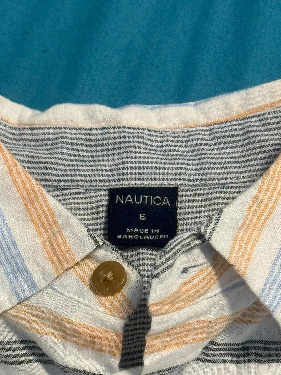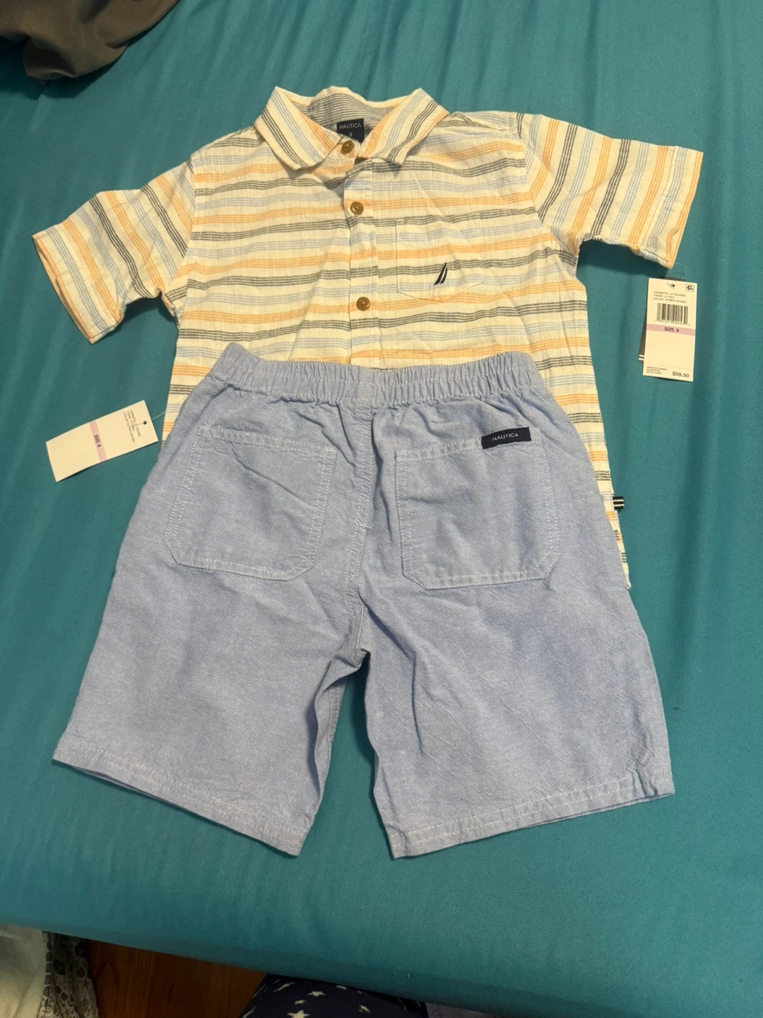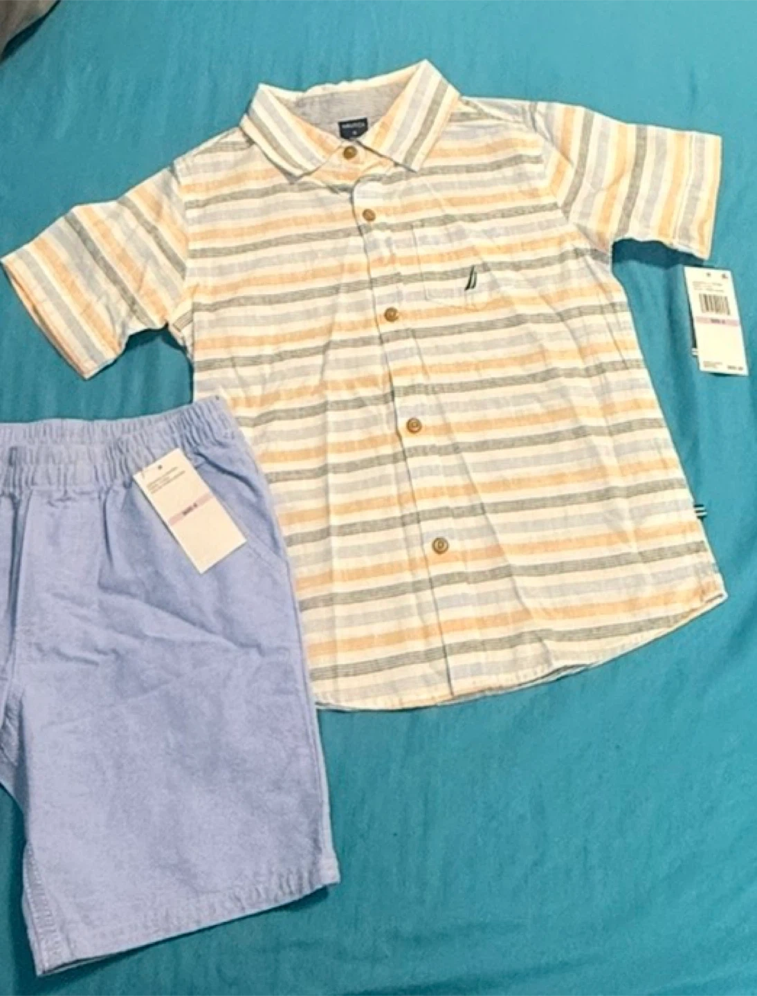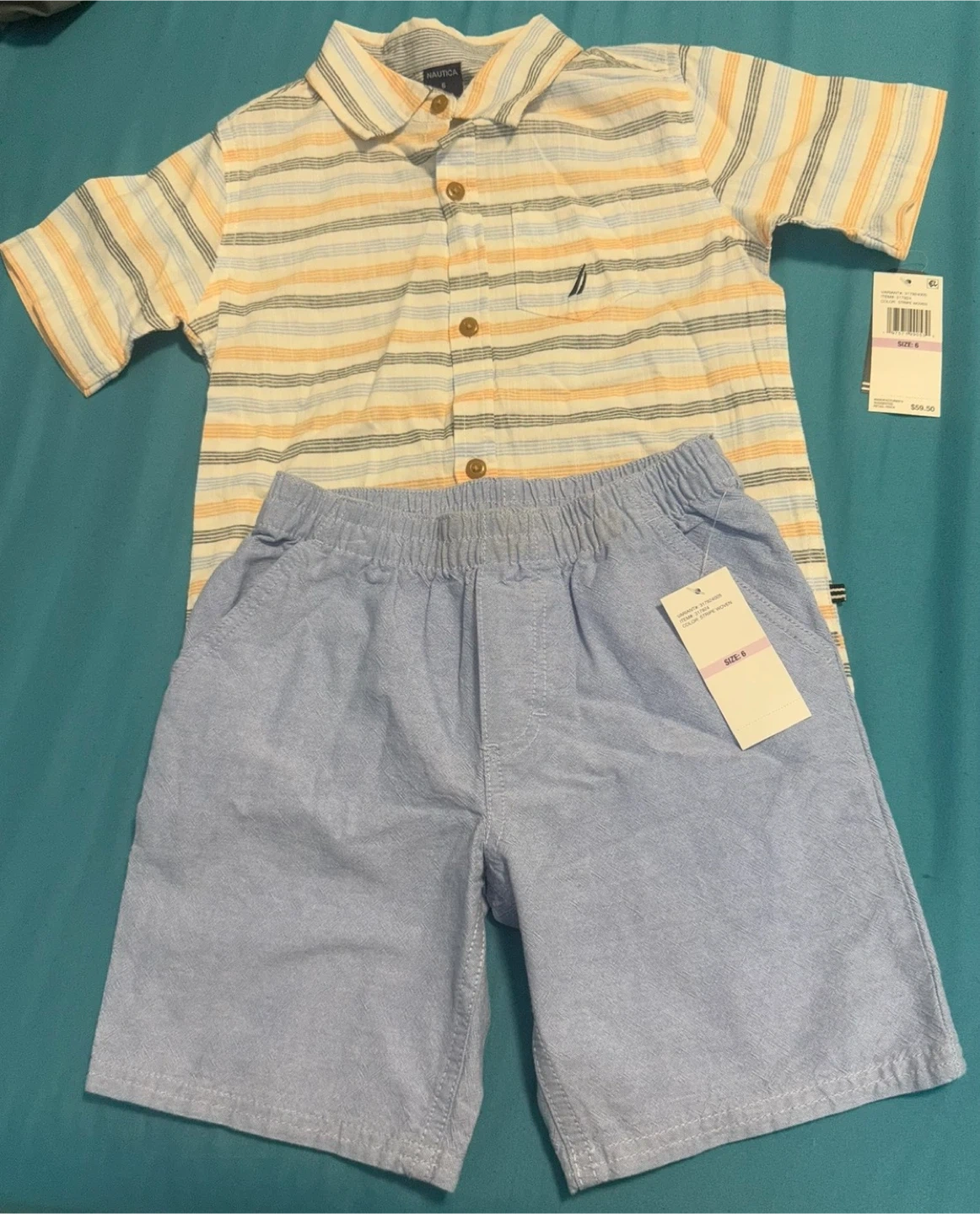 This is a new Nautica boys shirt and shorts set. The shirt has a striped pattern and the shorts are light blue. Both are size 6. It's perfect for warm weather!