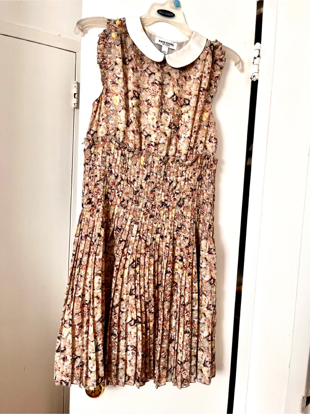 This is a Kate Young for Target sleeveless dress with a Peter Pan collar. It features a floral print with smocked waist and pleated skirt. Made in China. Size S/P.