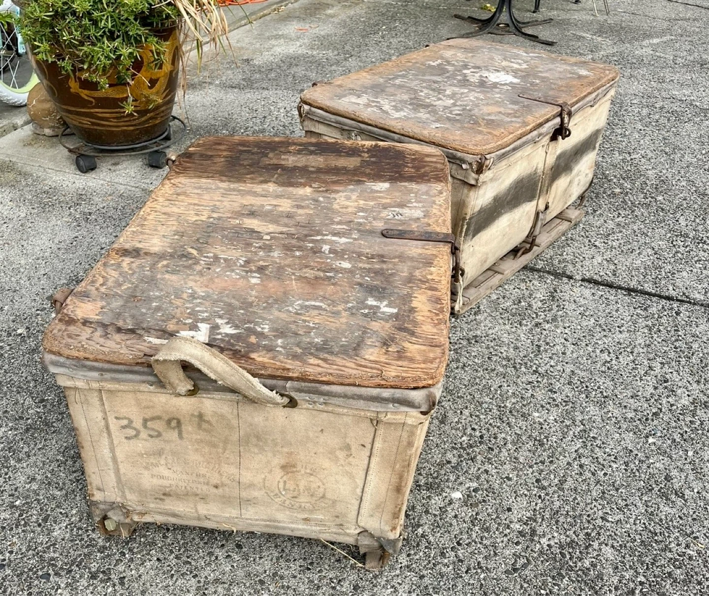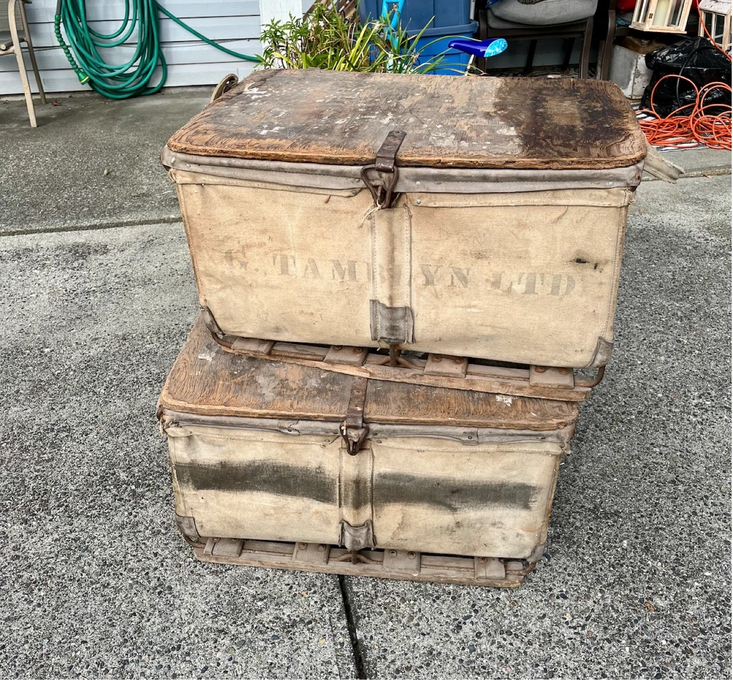 Early antique pharmacy canvas storage trunks would make great coffee tables or Display. G TAMBLYN LTD was before shoppers drug Mart.