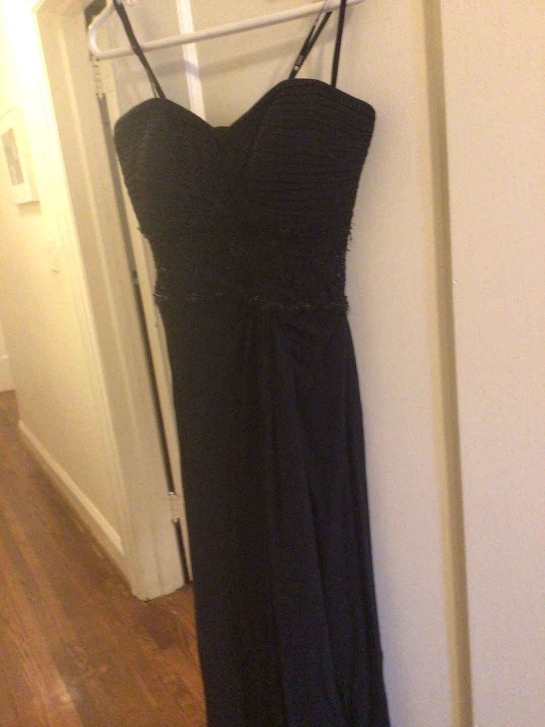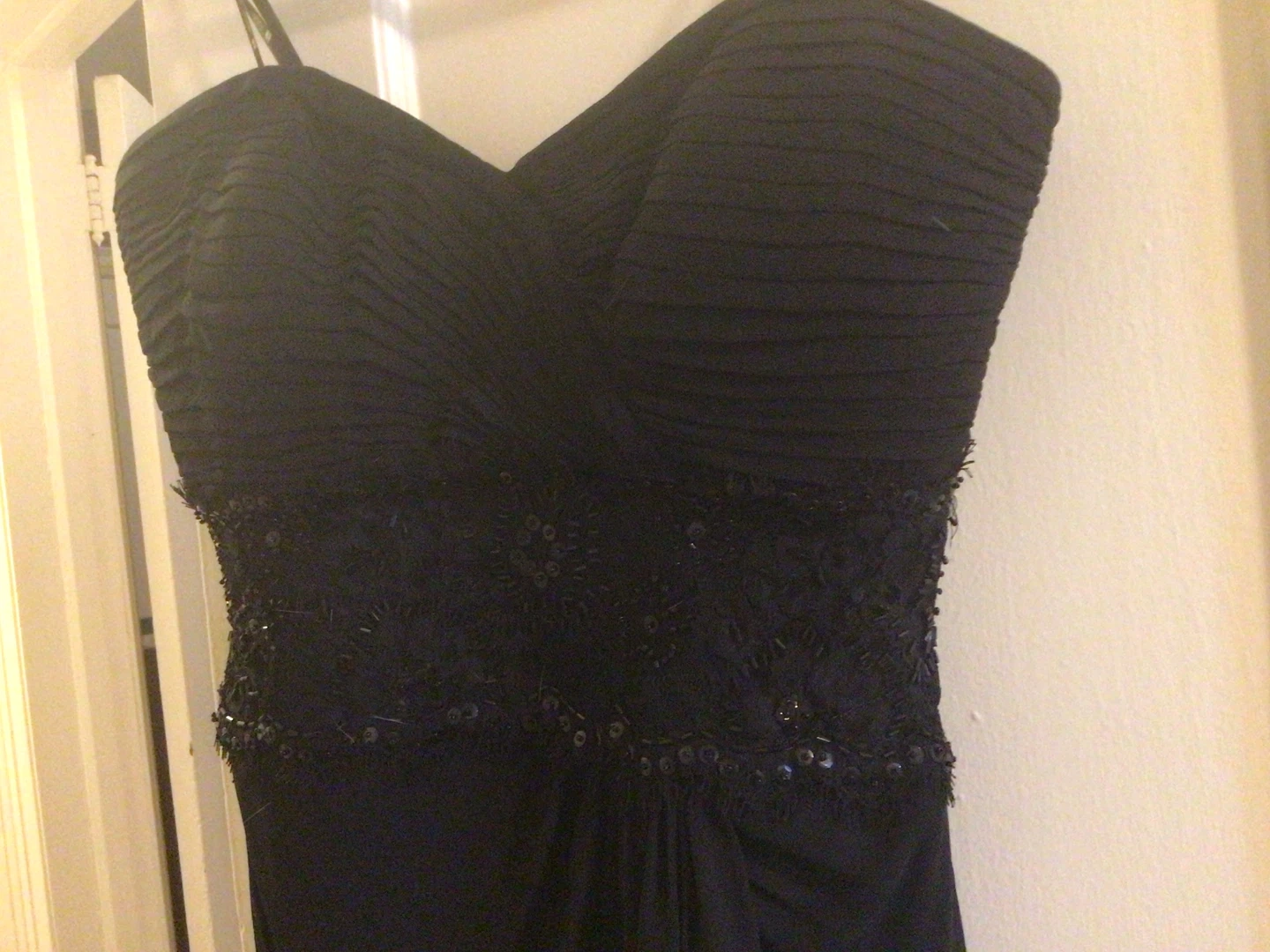 Black lace bolero jacket with sequin details. Matching black strapless formal dress with a ruched bodice and beaded waistband. Perfect for formal occasions!