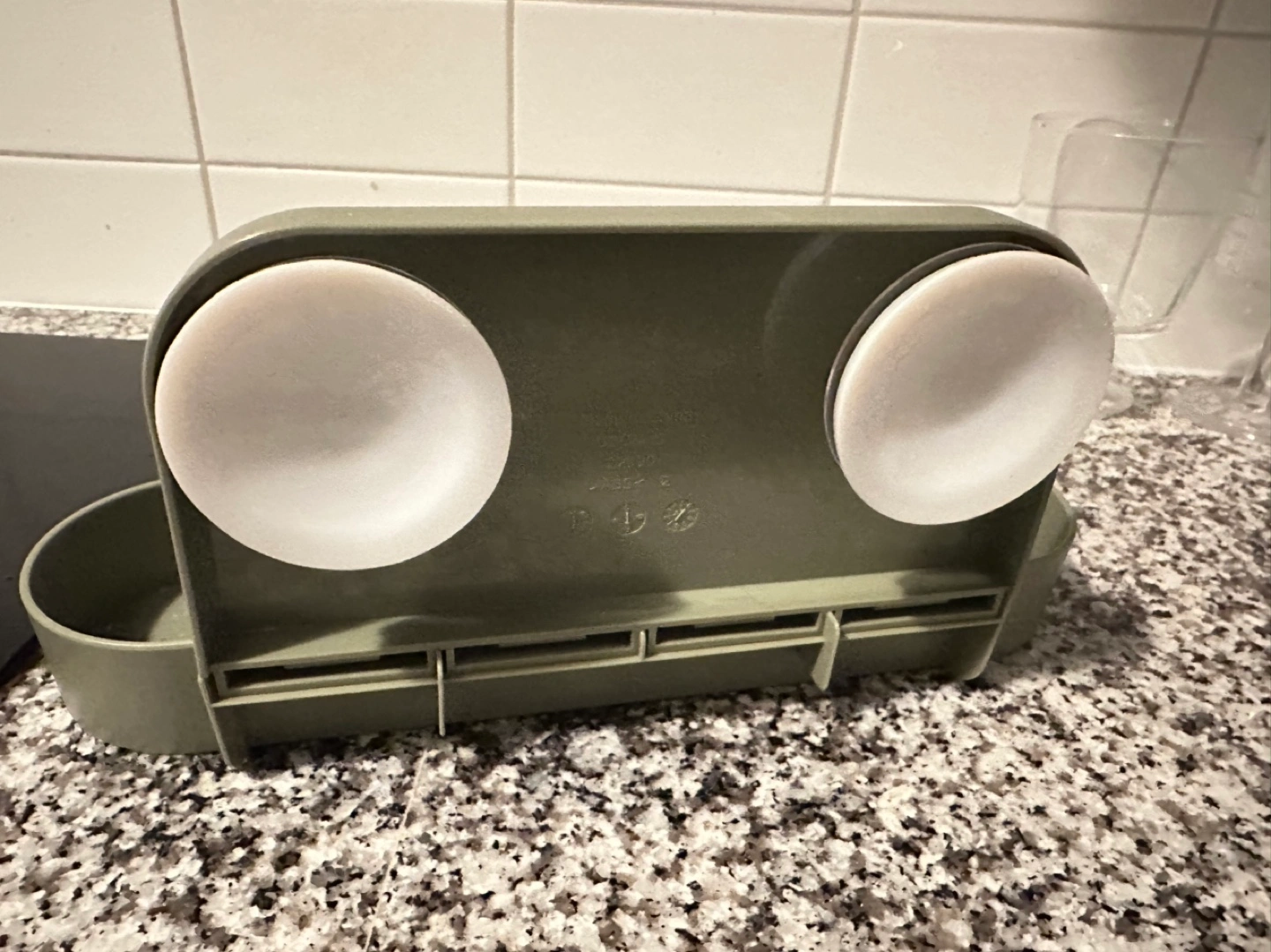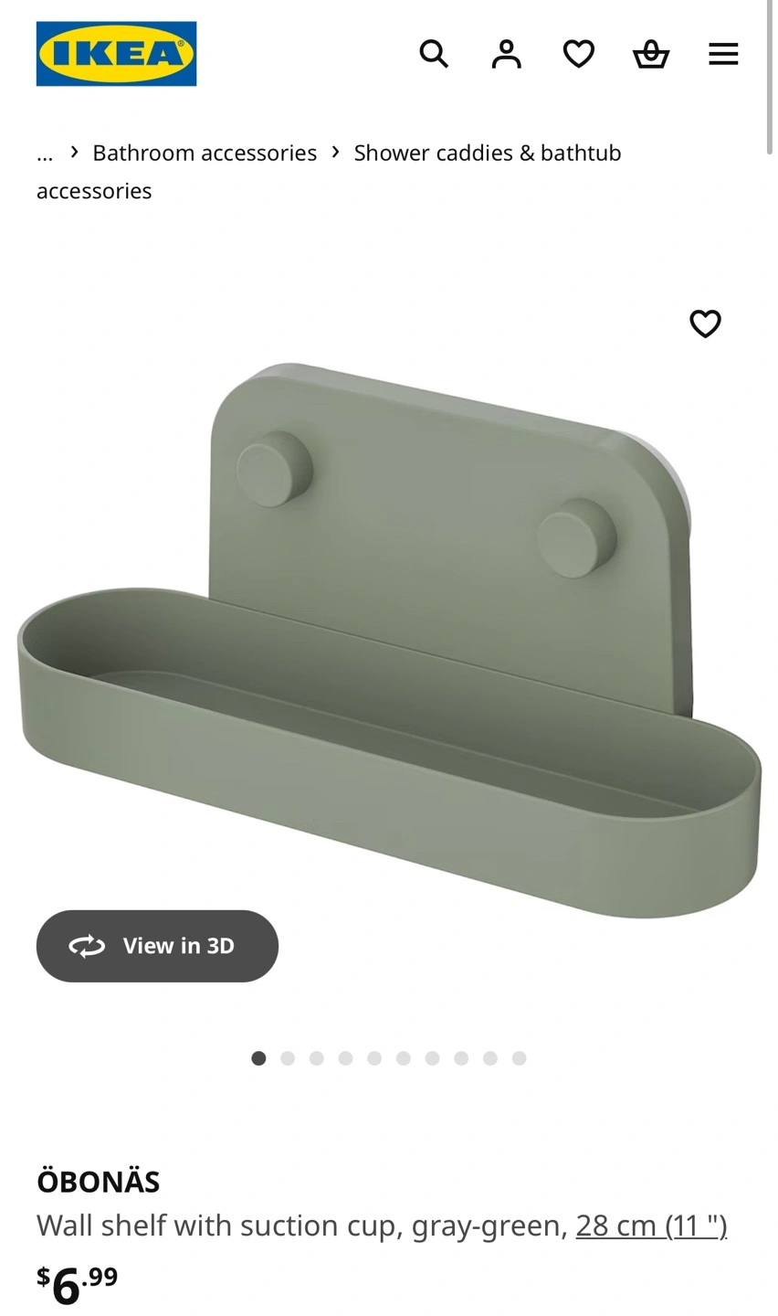 Used IKEA ÖBNAS wall shelf. Gray-green colour. Features a suction cup. Small tray for storage. Measures 28 cm (11").
