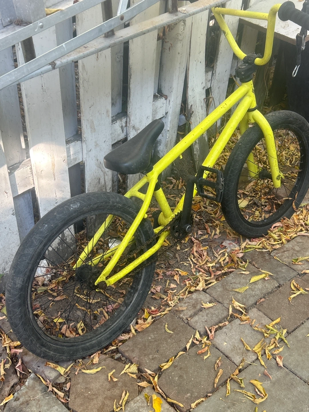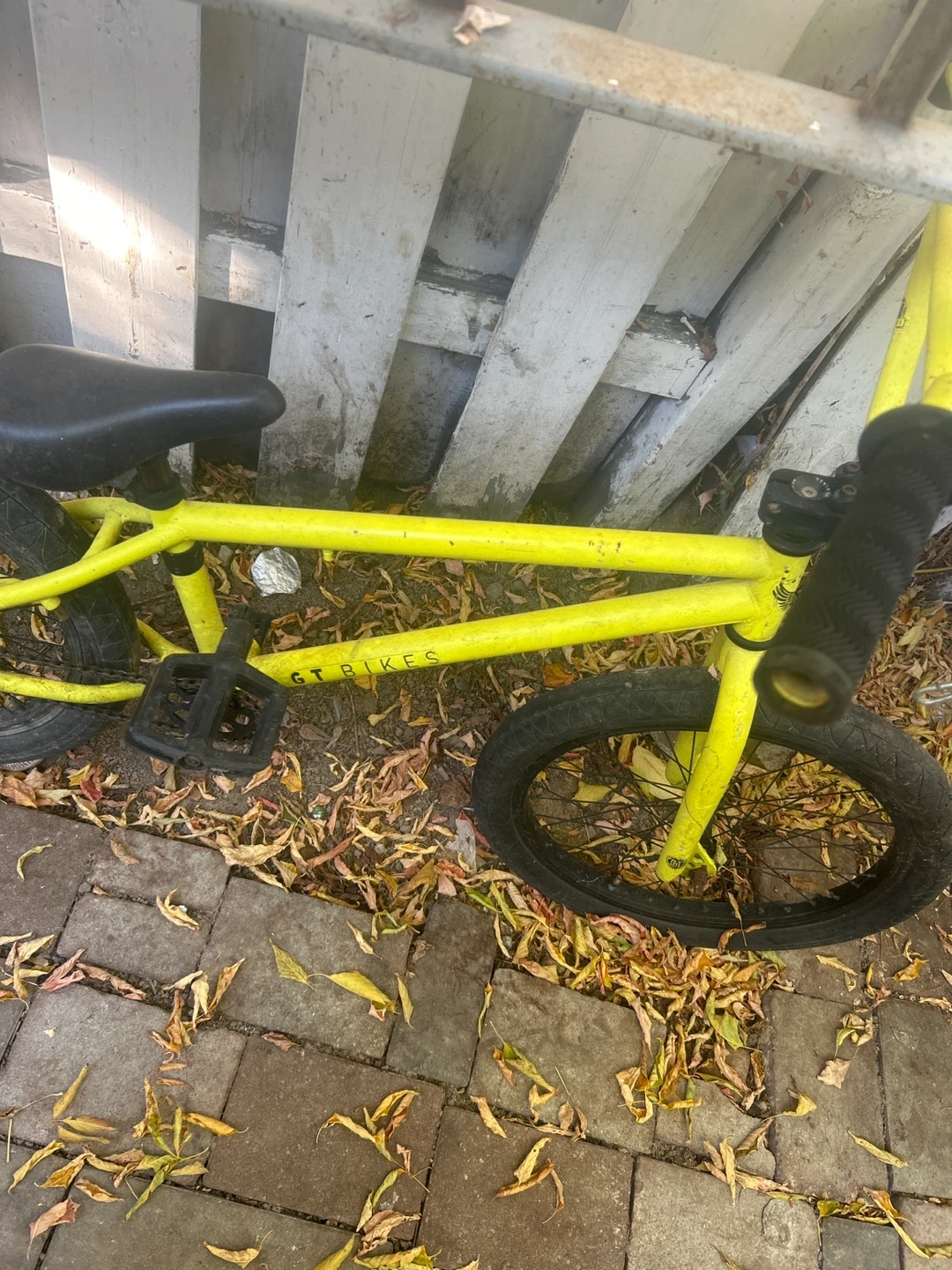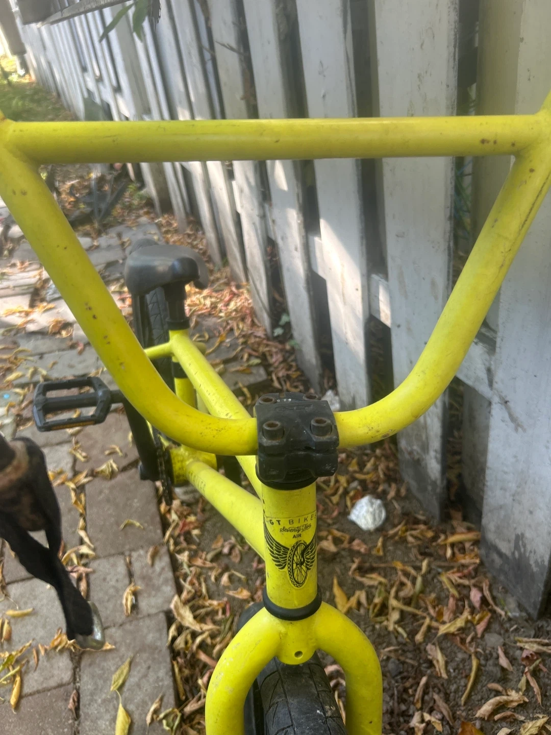 Selling a yellow GT BMX bike. It's ready for some action at the skate park or just cruising around the neighbourhood. It has a black seat and black tires.