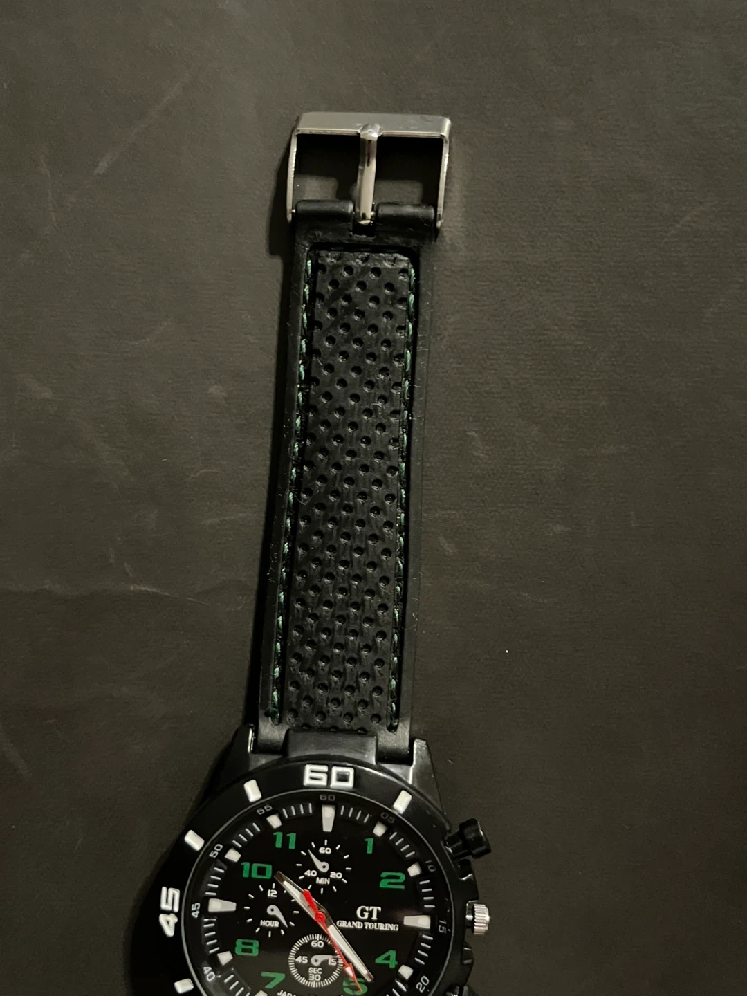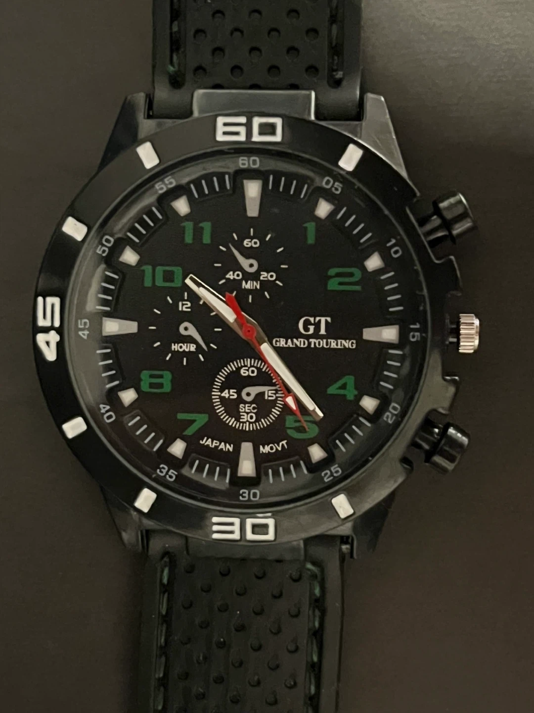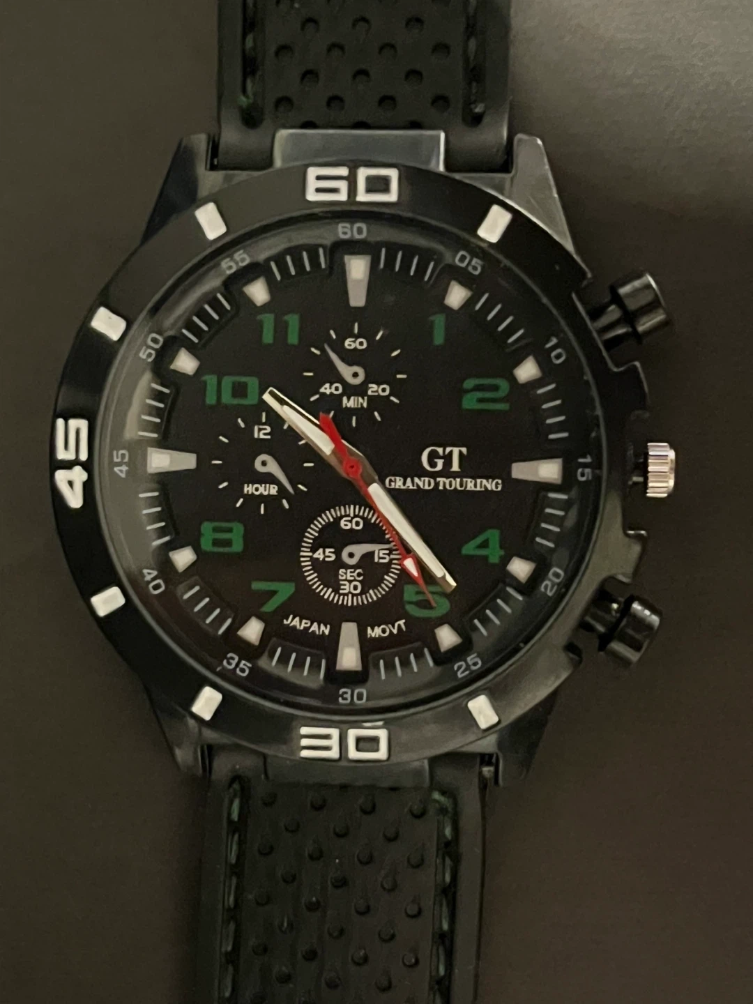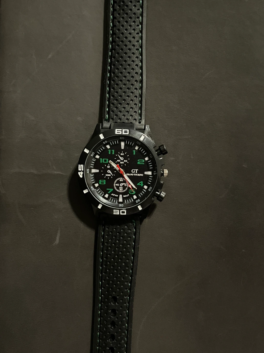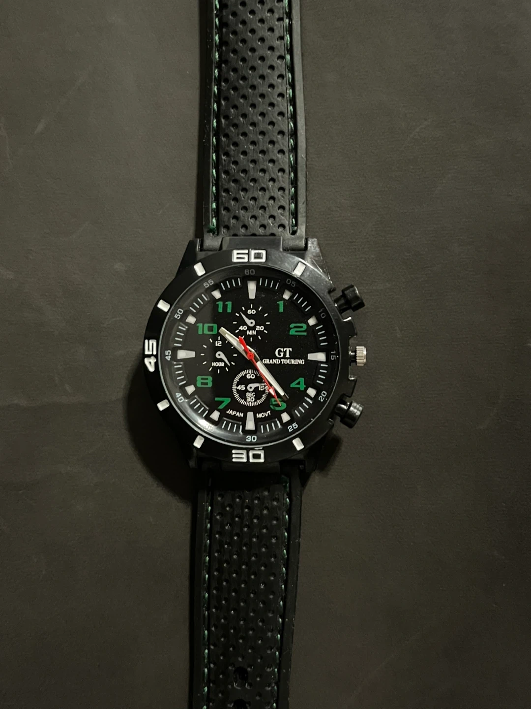 25Selling a GT Grand Touring watch in black. It has a sporty look with green accents on the numbers and hands. The watch features chronograph subdials and a textured strap. It's in great condition and ready for a new wrist!