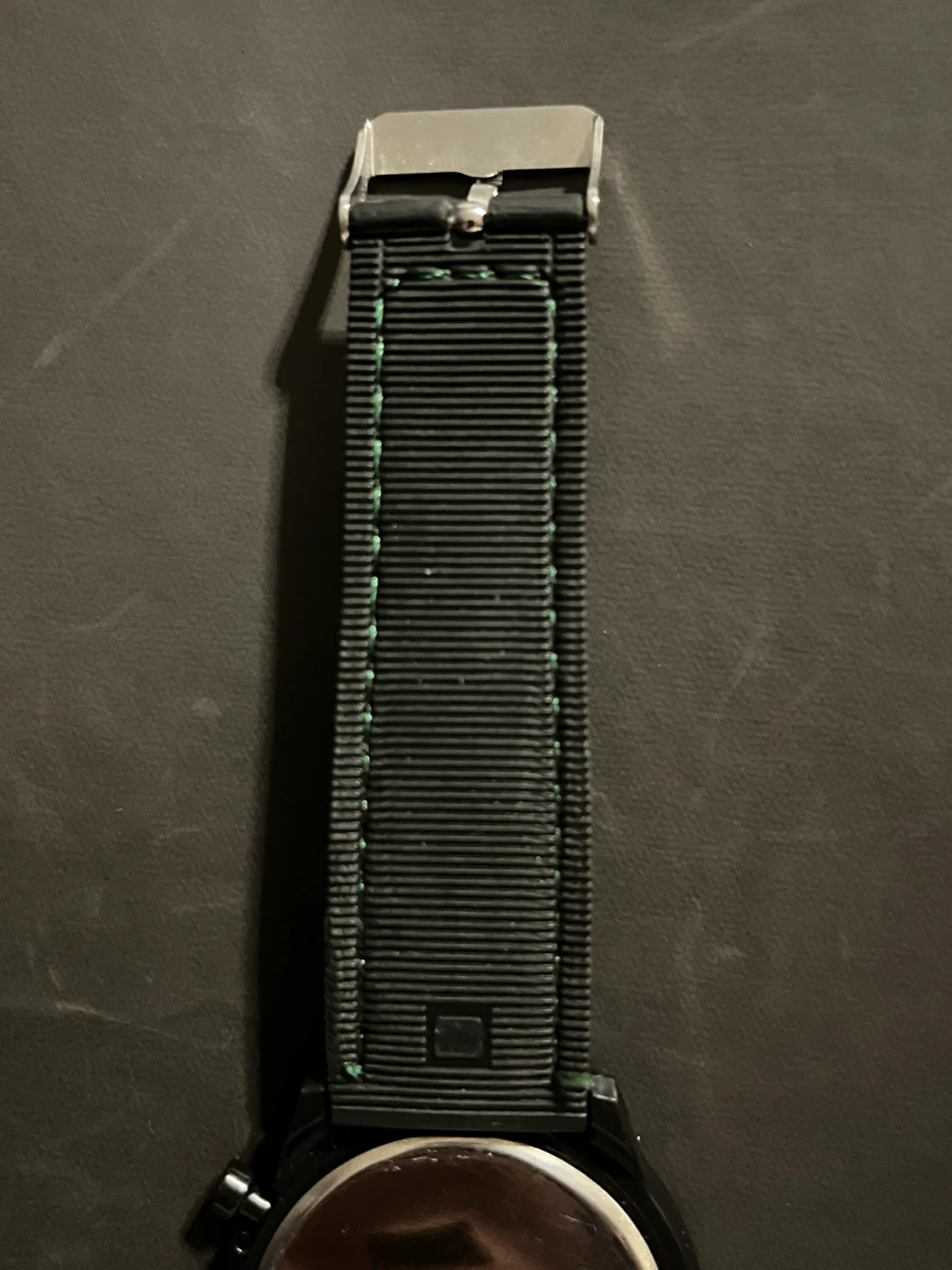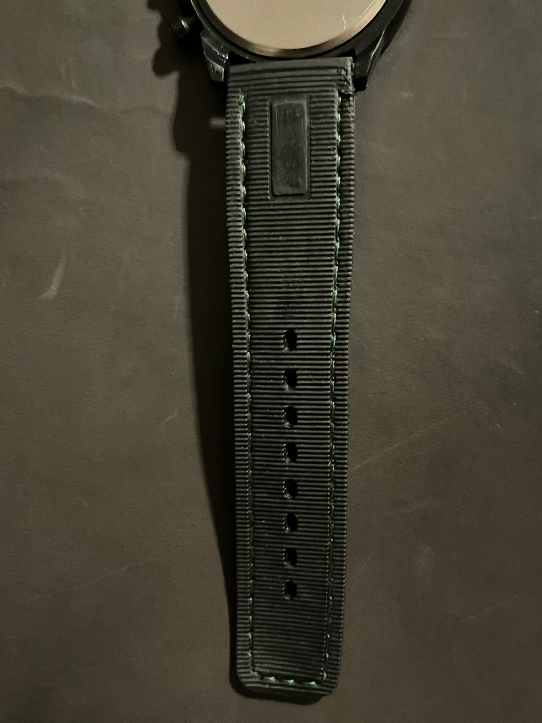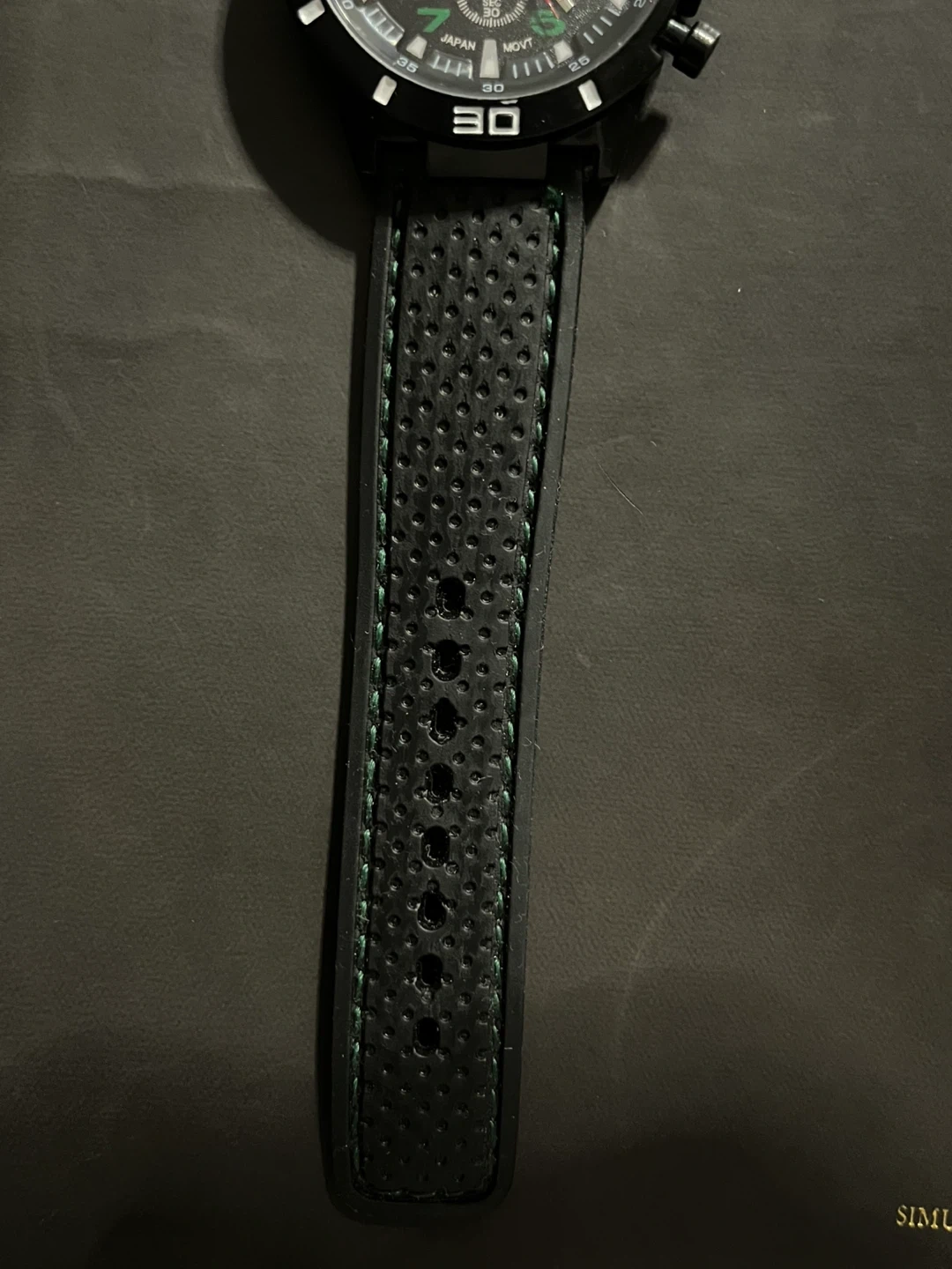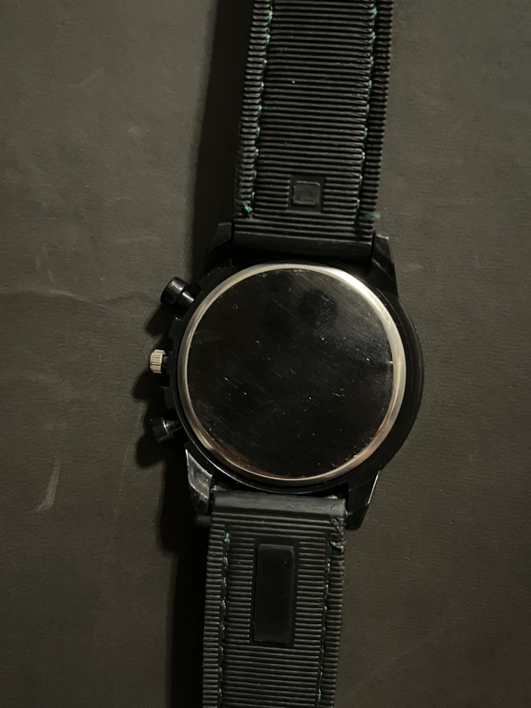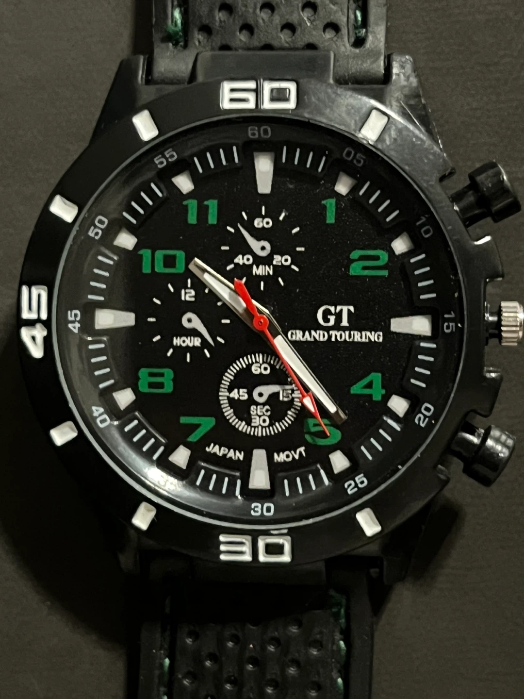 25Selling a GT Grand Touring watch in black. It has a sporty look with green accents on the numbers and hands. The watch features chronograph subdials and a textured strap. It's in great condition and ready for a new wrist!
