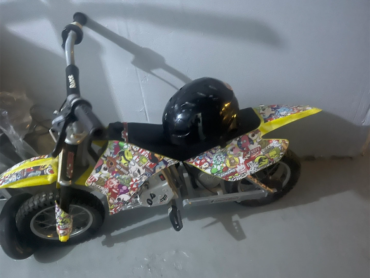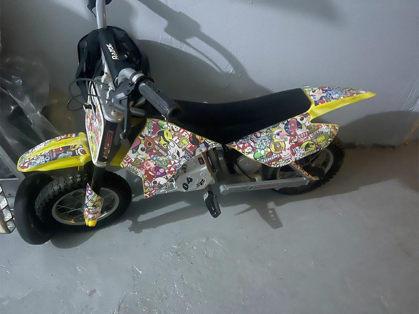 This is a Razor electric dirt bike covered in fun stickers. It includes a black helmet for safety. I have charger aswell