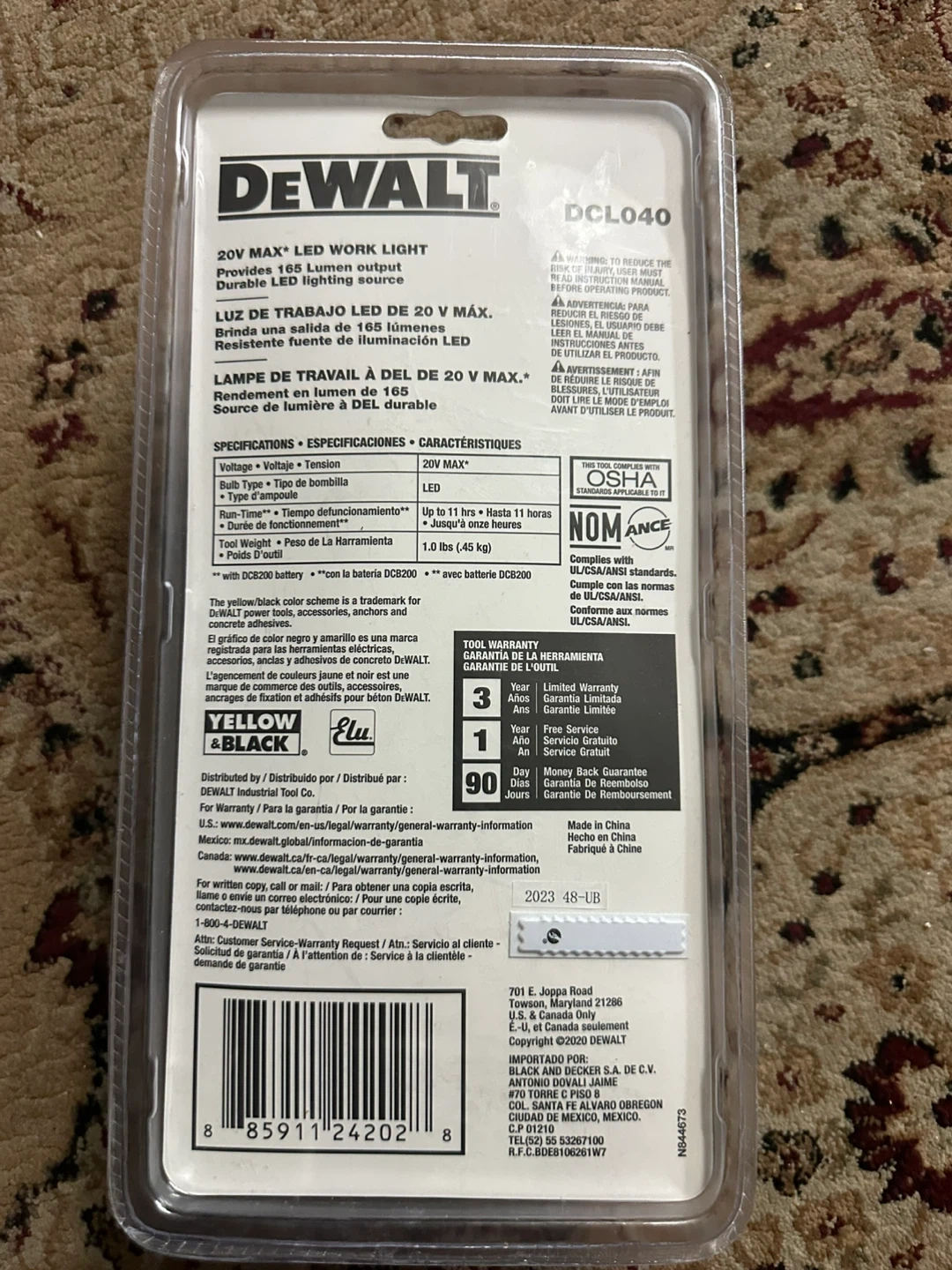 DEWALT DCL040 20V MAX LED Work Light. Includes 165 lumens light output. Tool weight 1.0 lbs (4.5 kgs). Guaranteed tough!
